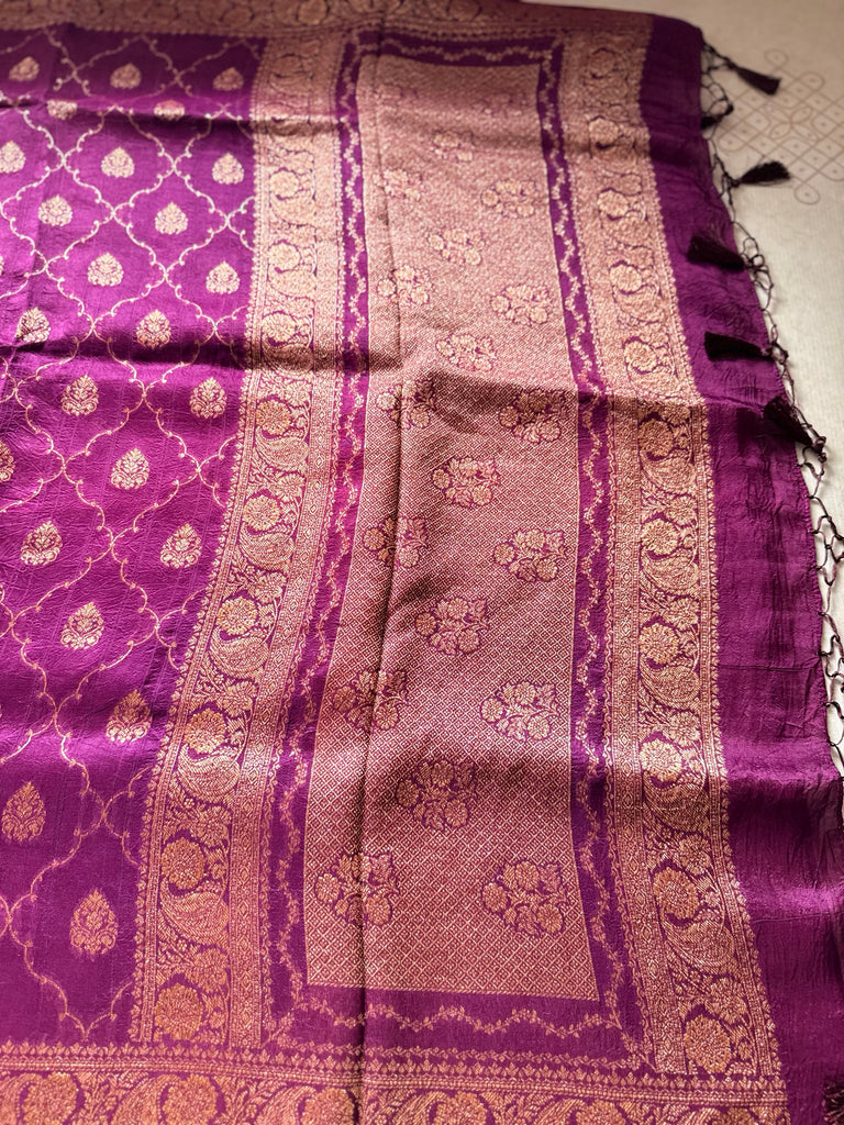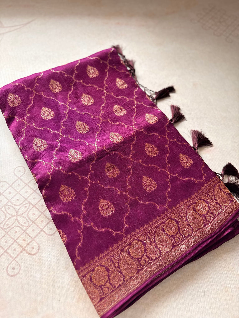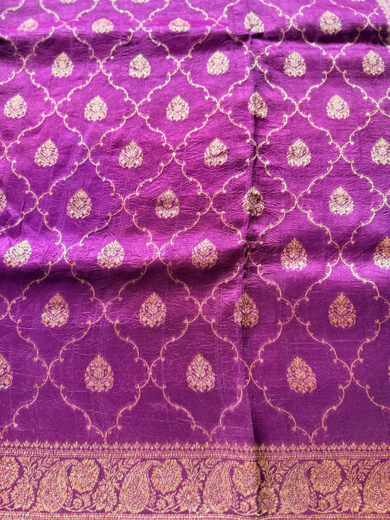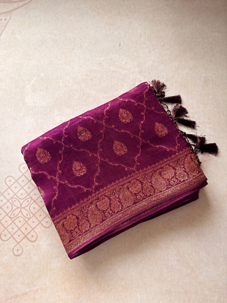 This stunning Burgundy Antique Banarasi saree, crafted from rich dupion silk, features exquisite jaal patterns woven intricately with fine zari work across the entire body. The luxurious weave showcases the beauty of traditional Banarasi craftsmanship, giving the saree a regal and elegant appeal.