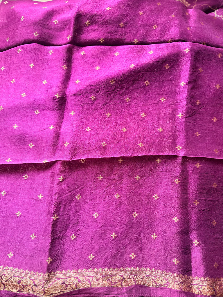 The border is adorned with classic zari motifs, adding depth and heritage charm, while the pallu carries traditional floral zari detailing with beautifully intricate patterns. Completing the ensemble, the matching blouse features delicate floral buttas throughout, along with a coordinated border, perfectly enhancing the elegance of the saree. A timeless and graceful piece, ideal for those who appreciate true artisanal beauty.