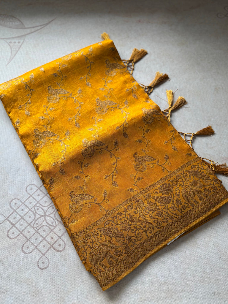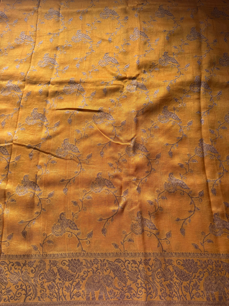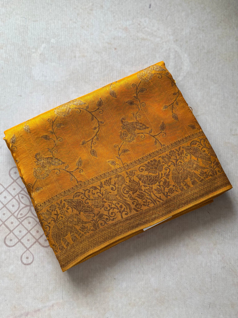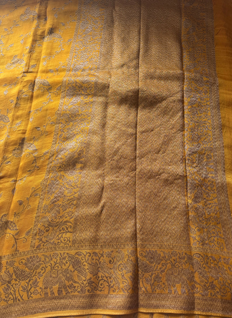 This adorable Antique Banarasi saree, crafted from luxurious dupion silk, features stunning leafy jaal patterns with peacock motifs woven beautifully across the body, bringing a touch of heritage artistry to every fold. The border is richly adorned with traditional zari designs, showcasing intricate elephants, parrots, and lotus motifs set within floral zari detailing, adding depth and grandeur to the saree.
