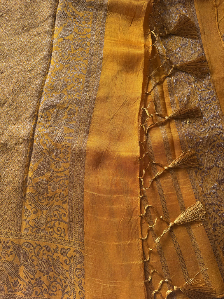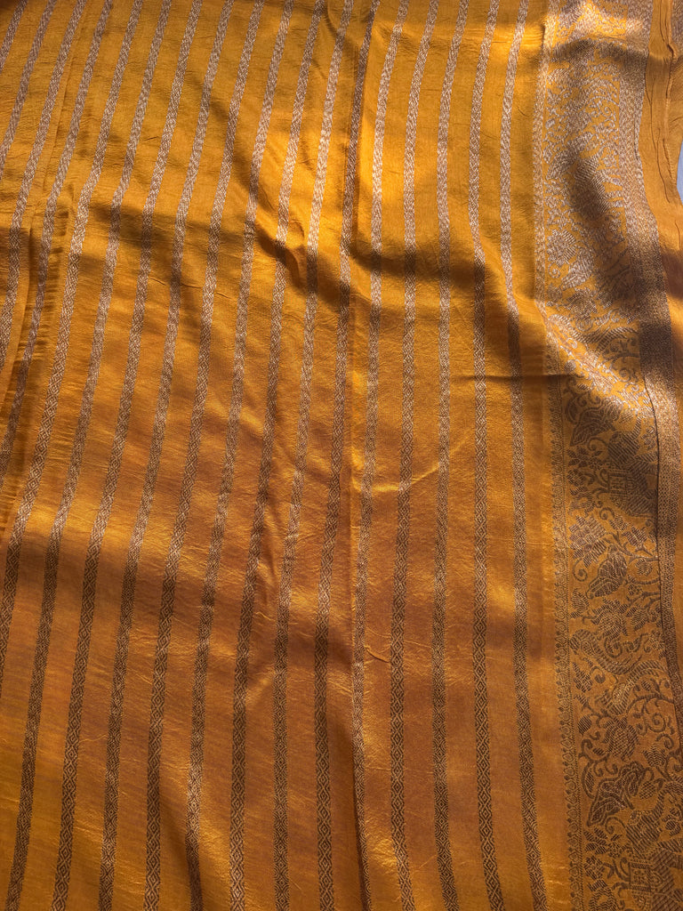 The pallu continues this traditional aesthetic with classic Banarasi zari work, finished with elegant tassels that enhance its vintage charm. The matching blouse complements the saree perfectly, designed with zari lines and detailed motifswoven within the stripes for a refined, coordinated look. A perfect blend of tradition, richness, and artisanal beauty, this saree is a timeless wardrobe treasure.