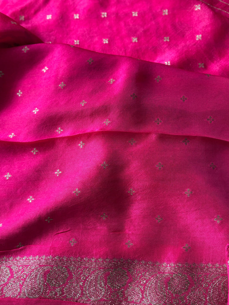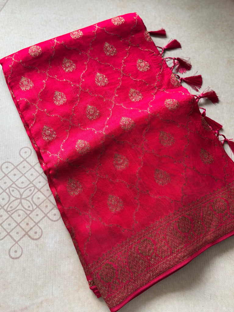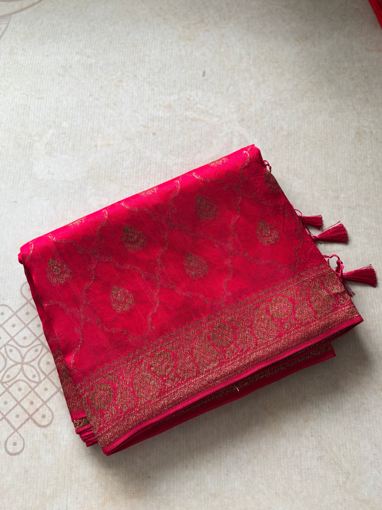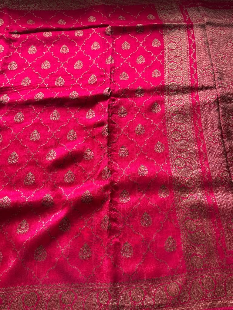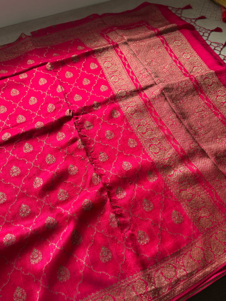 This stunning Dragon Fruit Pink Antique Banarasi saree, crafted from rich dupion silk, features exquisite jaal patterns woven intricately with fine zari work across the entire body. The luxurious weave showcases the beauty of traditional Banarasi craftsmanship, giving the saree a regal and elegant appeal.