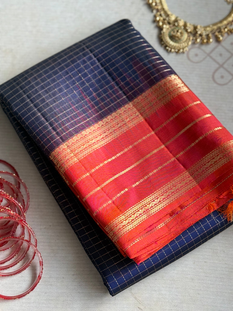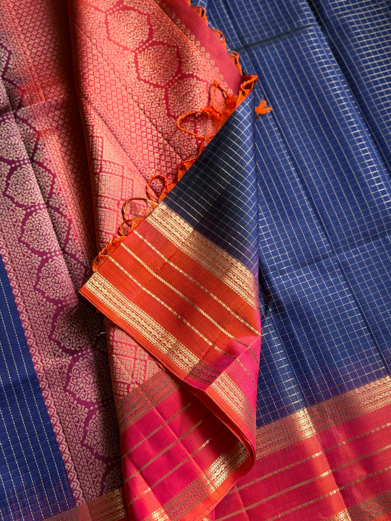 The saree is beautifully framed with a traditional varisai petta border, meticulously crafted with fine zari detailing that enhances its vintage charm. The harmonious contrast of blue and red brings depth and elegance, while the soft silk texture ensures a graceful drape and luxurious feel.