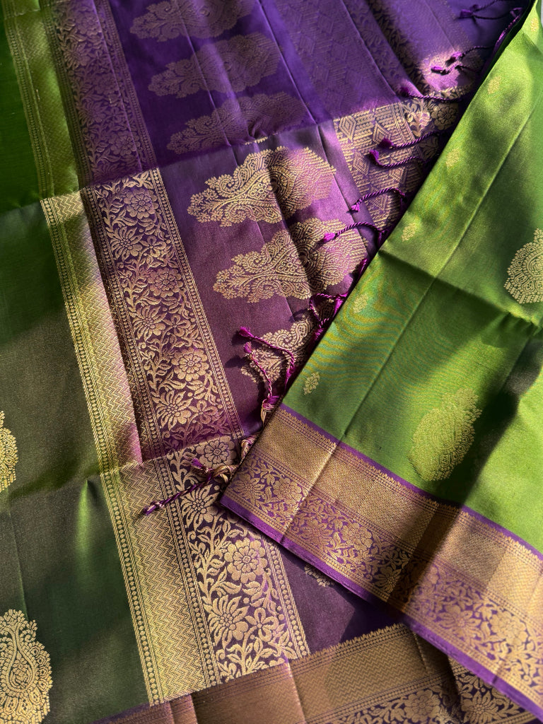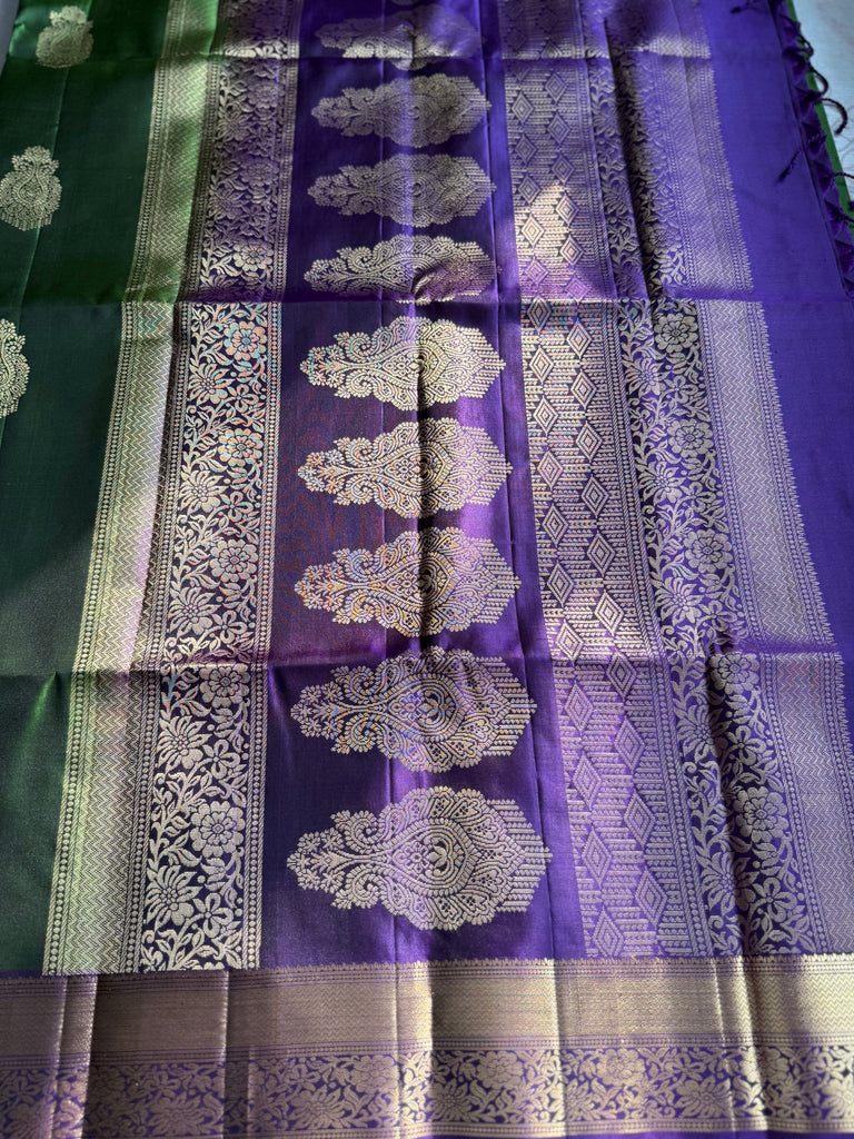 The saree is framed with a striking deep purple border, enriched with classic gold zari floral and geometric motifs, creating a regal contrast against the green silk. The soft silk texture ensures a graceful drape while retaining the authentic weight and sheen Kanjivaram sarees are celebrated for.