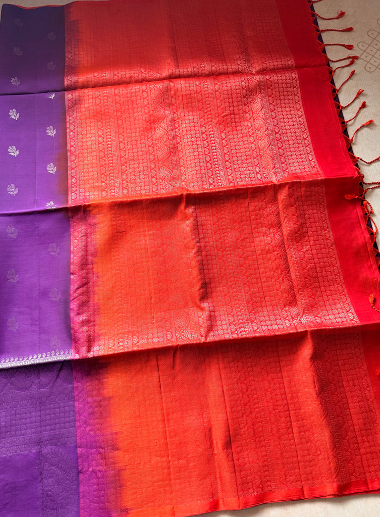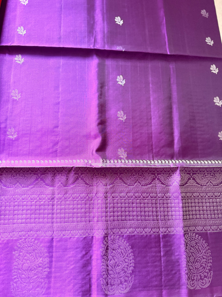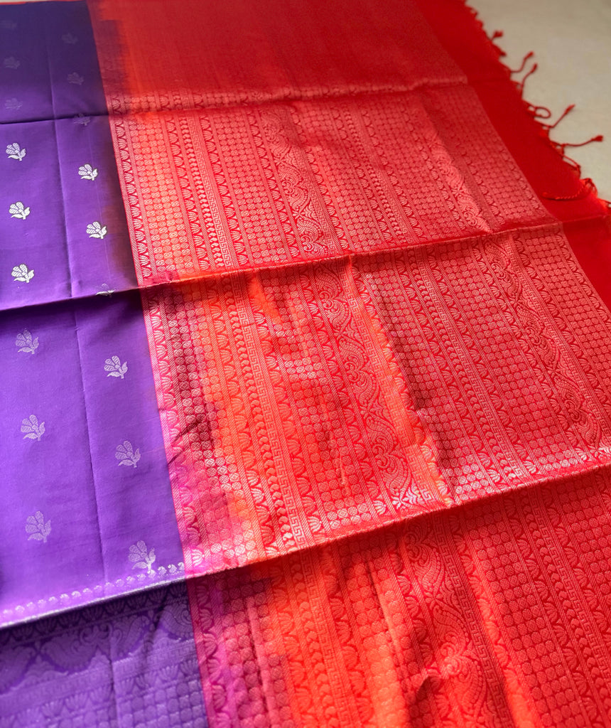 Enhance your wardrobe with the stunning Saarah Soft Silk Kanchipuram saree. Adorned with delicate silver zari floral motifs, this saree boasts a traditional mango motif border and intricate zari detailing on the contrasting red pallu. Complete with a plain blouse, pair it with our hand-embroidered gota patti blouse for a elevated look. Expertly crafted for a timeless, elegant appeal.
