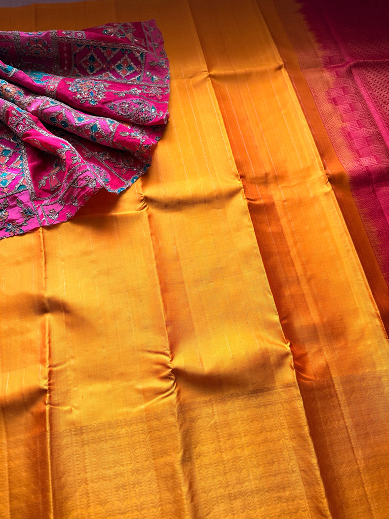 Upgrade your wardrobe with Saarah -Soft Silk Kanchipuram saree. Crafted from pure soft silk, this saree features intricate zari lines and a beautifully woven border design. The contrasting pink pallu adds a touch of elegance to this saree. Complete your look with a plain blouse or pair it with our stunning Gota patti Hand Embroidered Blouse.