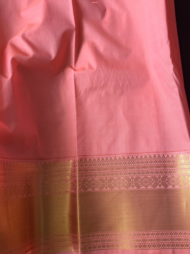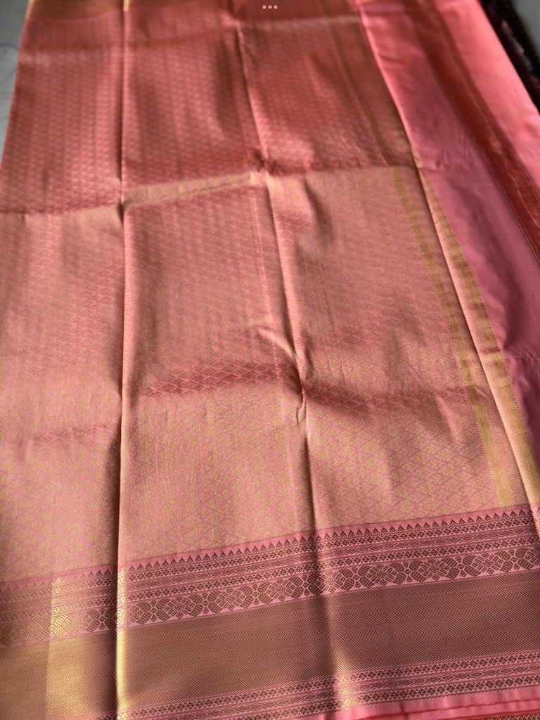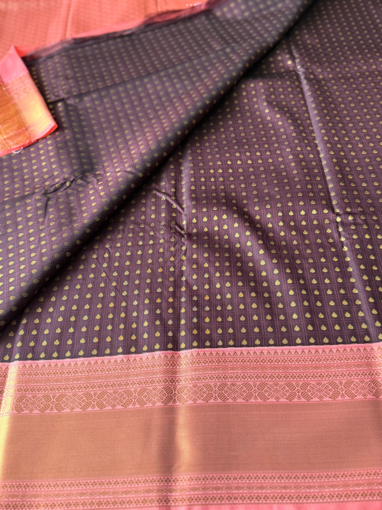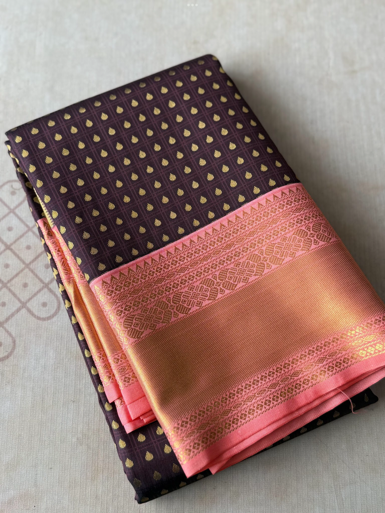Bring festive charm to your wardrobe with this stunning semi Kanchi silk saree. The body is adorned in a dates brown base, decorated with delicate zari buttas that add subtle sparkle and elegance. The traditional zari woven peach border is astonishing with the traditional gold zari detailing.
