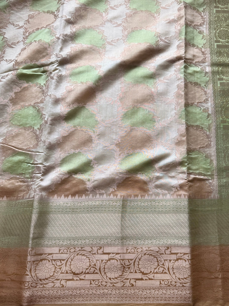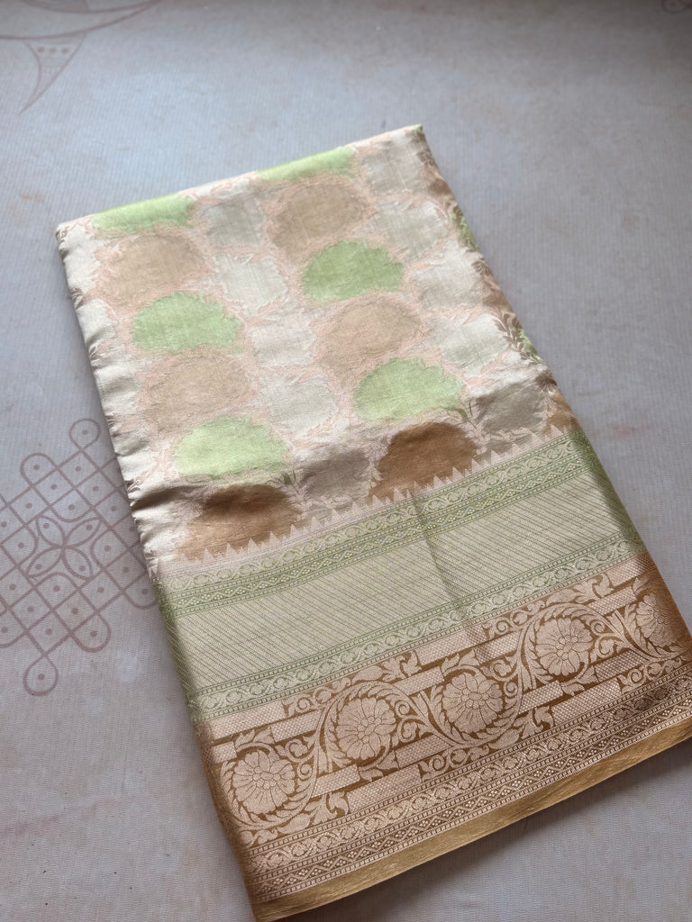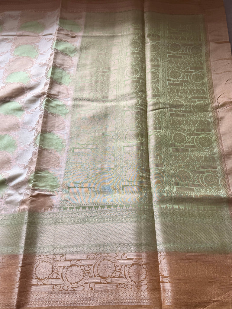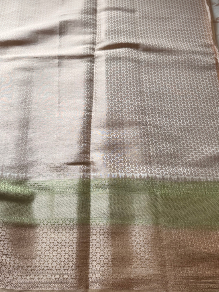 Step into understated elegance with this Pure Chiniya Silk Saree, crafted in serene tones of pastel beige and pista green. The saree features softly woven floral motifs across the body, lending it a graceful and refined visual texture. The borders and pallu are intricately detailed with Banarasi-inspired zari weaving, showcasing floral vines, geometric patterns, and fine ornamental detailing that enhance its luxurious appeal.