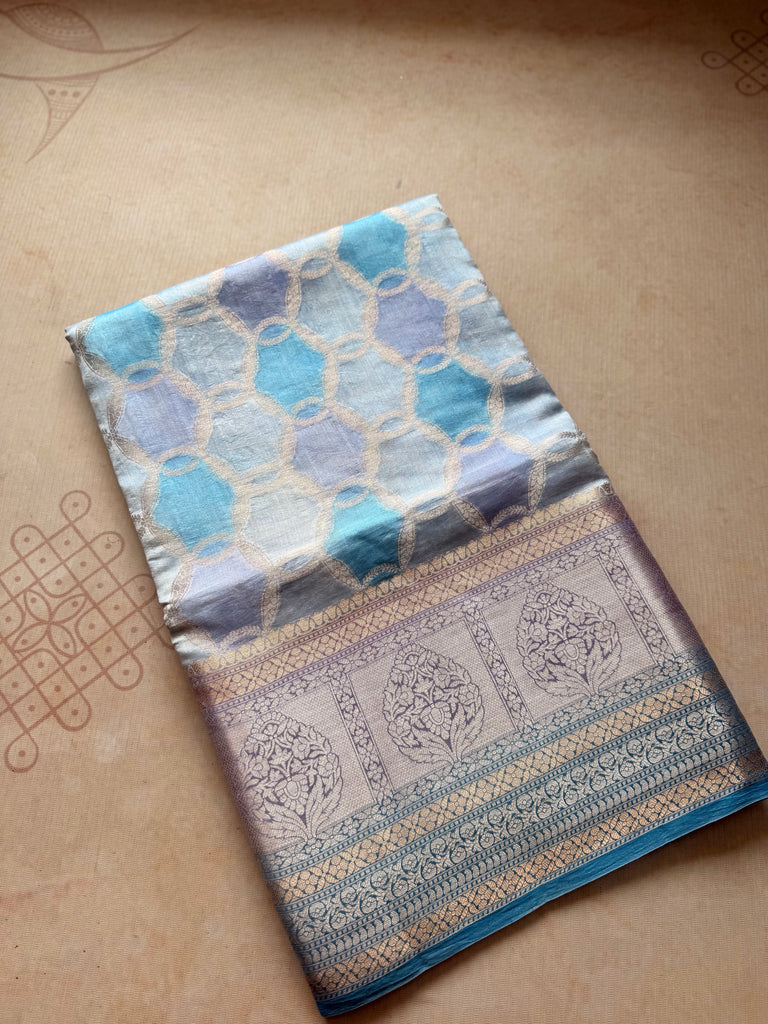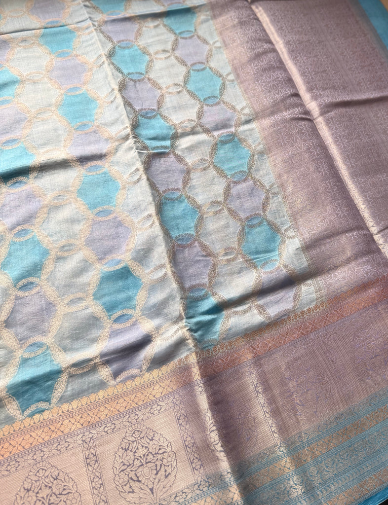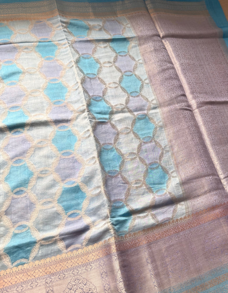 Step into understated elegance with this Pure Chiniya Silk Saree, crafted in serene tones of Icy Blue & Lavender Dual Tone. The saree features softly woven floral motifs across the body, lending it a graceful and refined visual texture. The borders and pallu are intricately detailed with Banarasi-inspired zari weaving, showcasing floral vines, geometric patterns, and fine ornamental detailing that enhance its luxurious appeal.