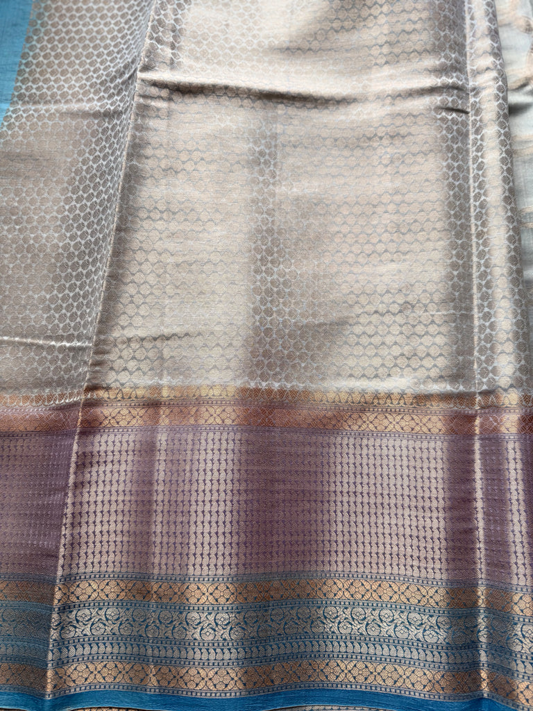 The saree is paired with a matching blouse piece in a soft beige-gold shade. The blouse fabric carries an all-over delicate diamond butta weaving, complemented by a subtle zari border for the sleeves — allowing it to be styled in both traditional and contemporary blouse patterns with ease. Together, the saree and blouse create a harmonious and elegant pastel ensemble that drapes beautifully and feels feather-light.