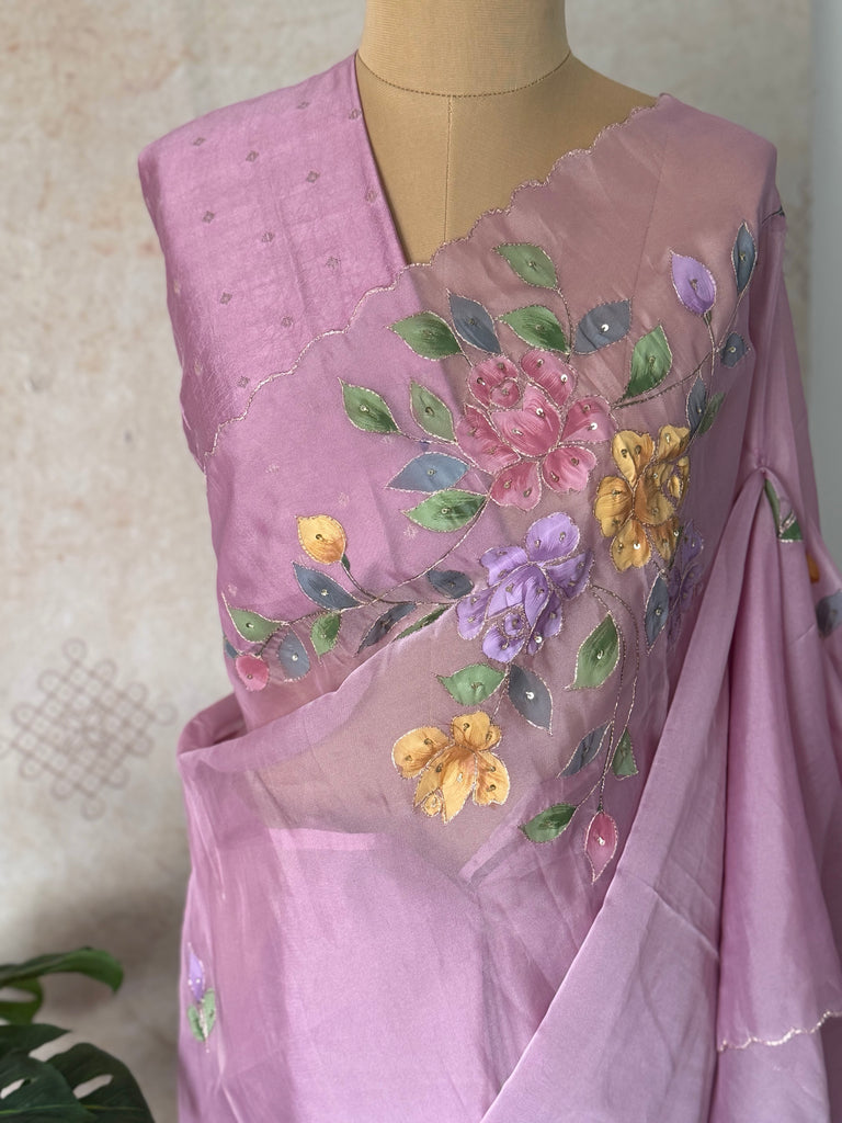 The saree is adorned with exquisite hand-embroidered floral motifs, delicately hand-painted using watercolour techniques and further enhanced with fine sequin detailing intricately placed within the florals. This subtle shimmer adds depth and movement, catching the light beautifully without overpowering the saree’s soft, elegant aesthetic.