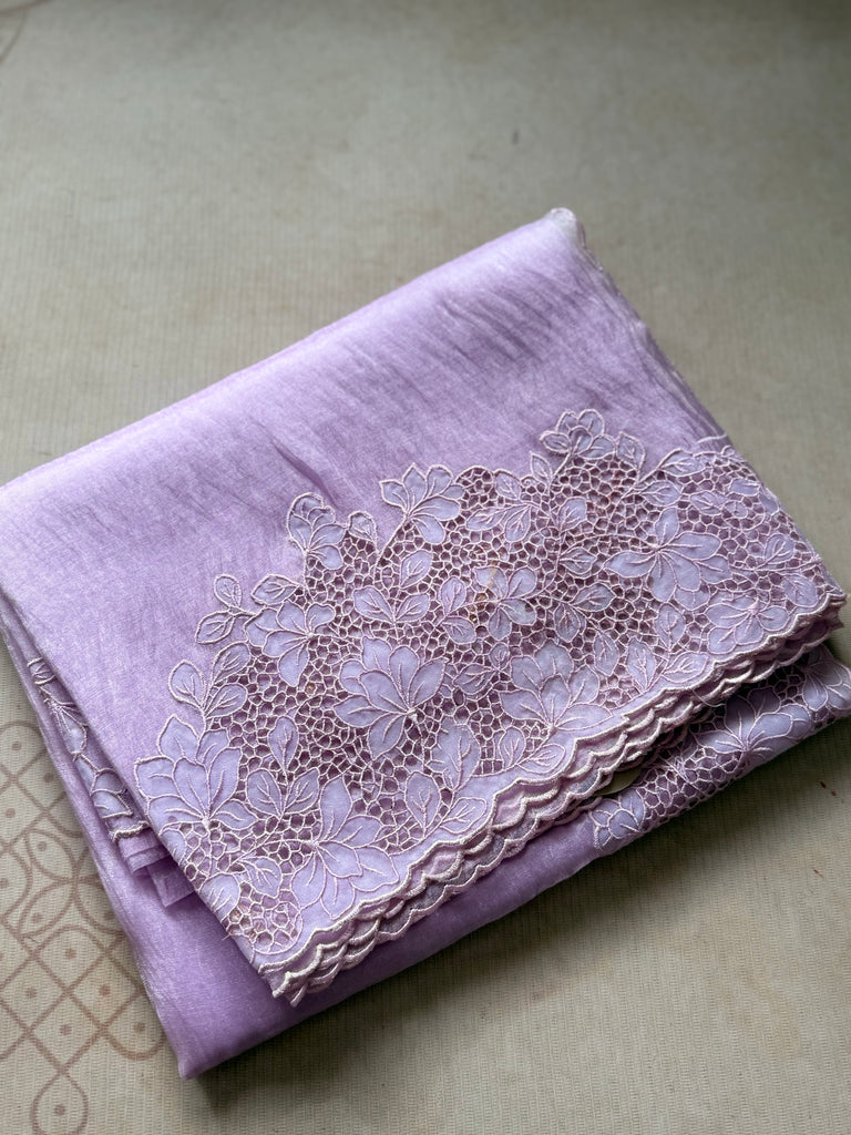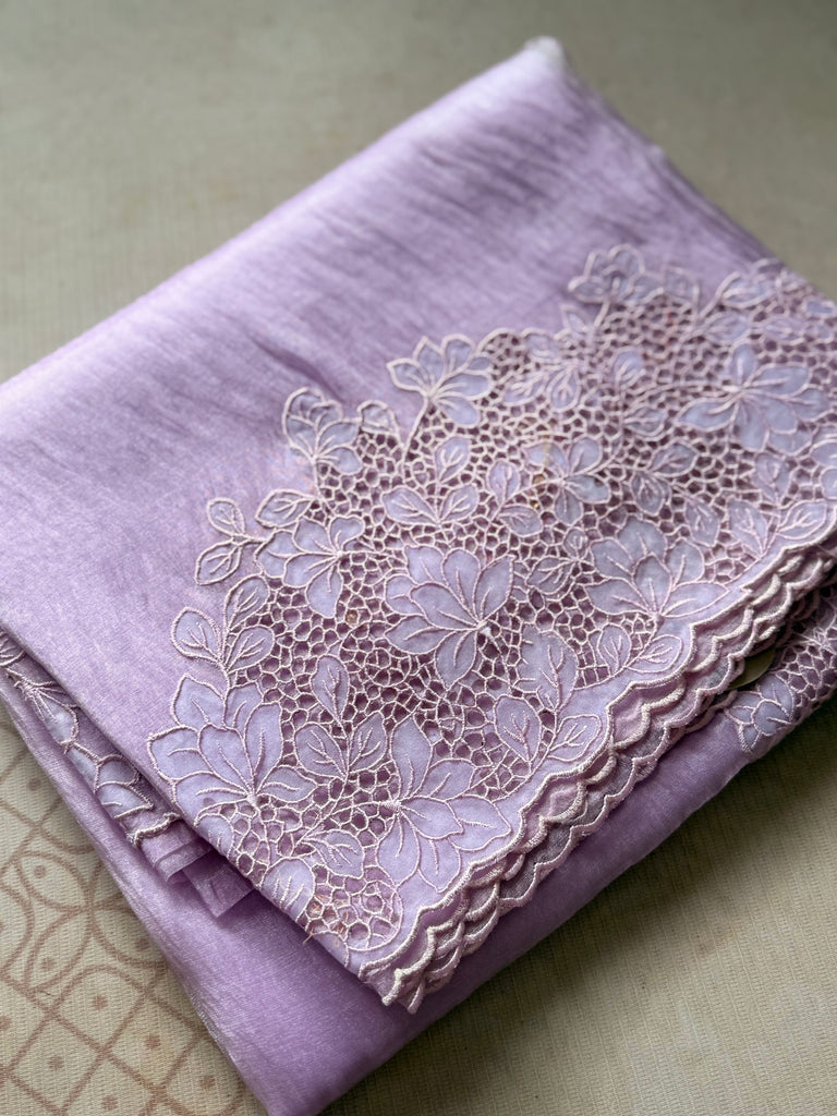 This elegant Lilac Oraganza saree exudes sophistication with its subtle shimmer and graceful drape. Crafted from fine organza, the saree beautifully reflects light, creating a soft, radiant glow with every movement. The highlight of this masterpiece lies in its exquisite floral cutwork embroidery, meticulously handcrafted along the borders and pallu. Each floral motif features delicate petal-shaped cutouts outlined with fine threadwork, forming intricate lace-like patterns that add dimension and texture to the sheer organza base.