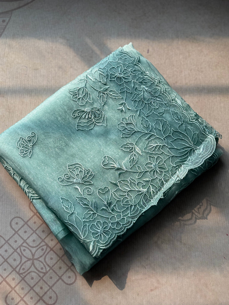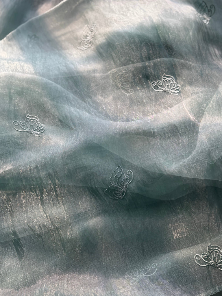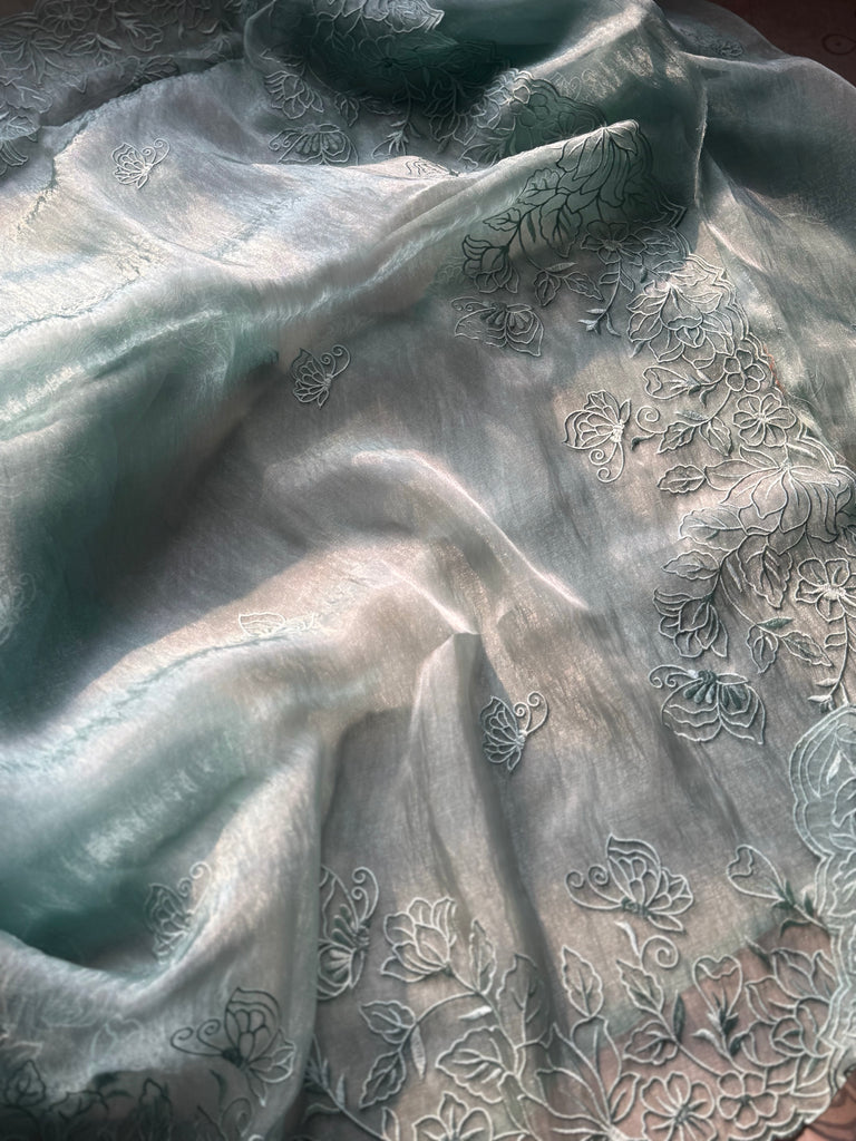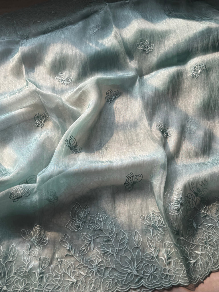 A delicate dream woven in pastel turquoise blue, this Organza saree glimmers gently under light with its natural shimmer. Adorned with intricate self-embroidered motifs, it features graceful butterfly patterns scattered across the body, symbolizing lightness and freedom. The borders bloom with exquisite floral embroidery, seamlessly flowing into the pallu, creating a harmonious play of texture and sheen.