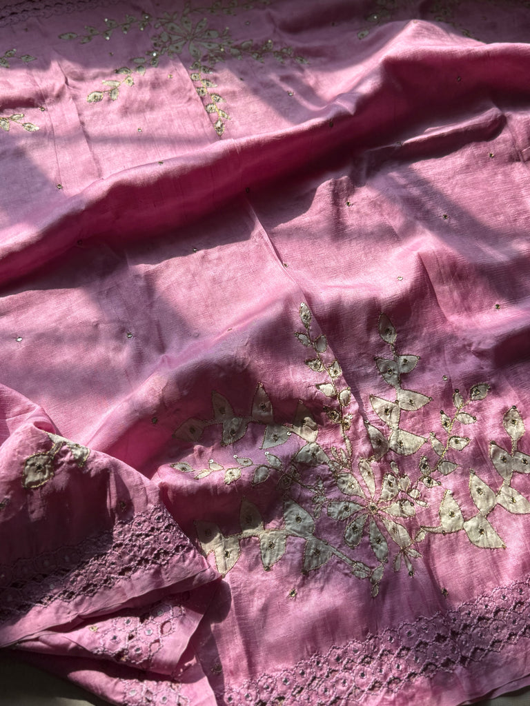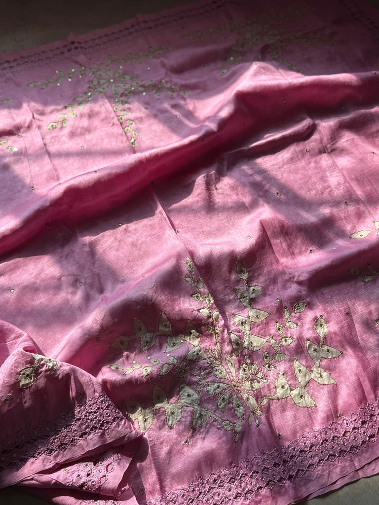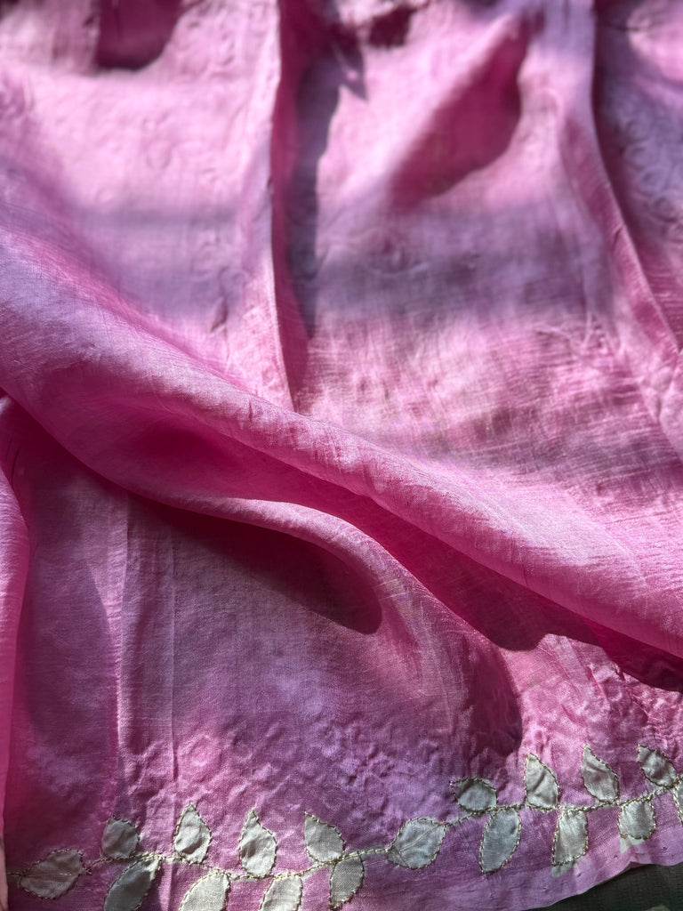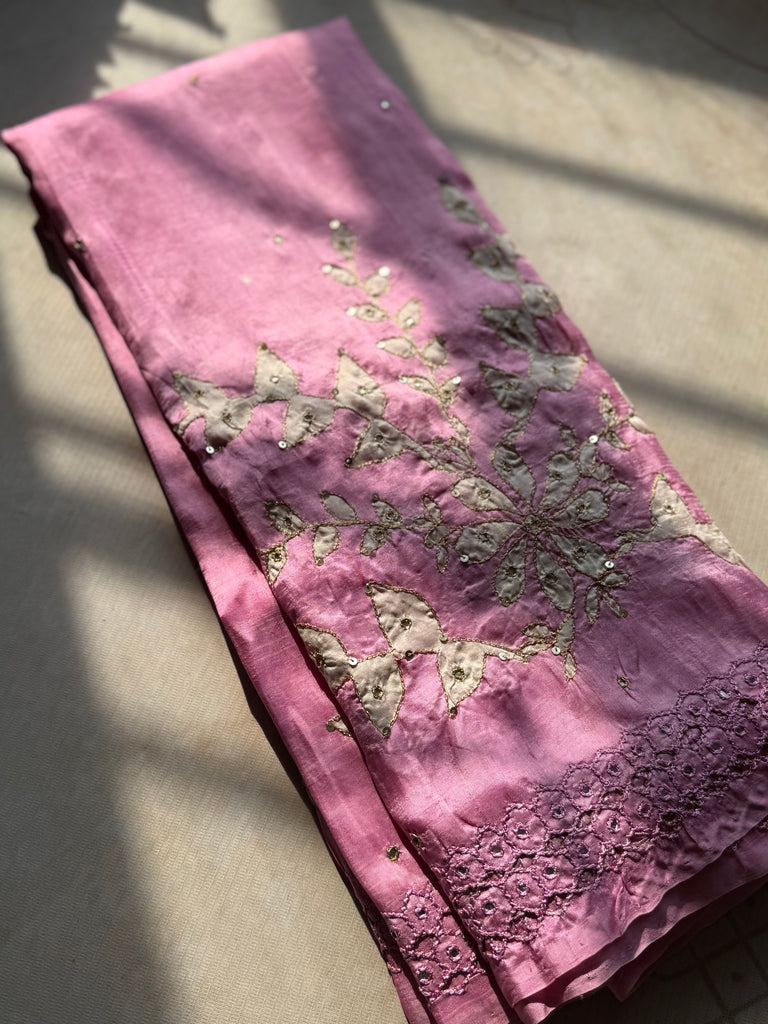 This rosemilk pink tussar saree drapes like a whisper of elegance, adorned with dreamy white floral prints that unfold gracefully across the body. Each bloom is brought to life with delicate threadwork, subtle sequins, and tiny mirrors that catch the light with a soft, enchanting shimmer.