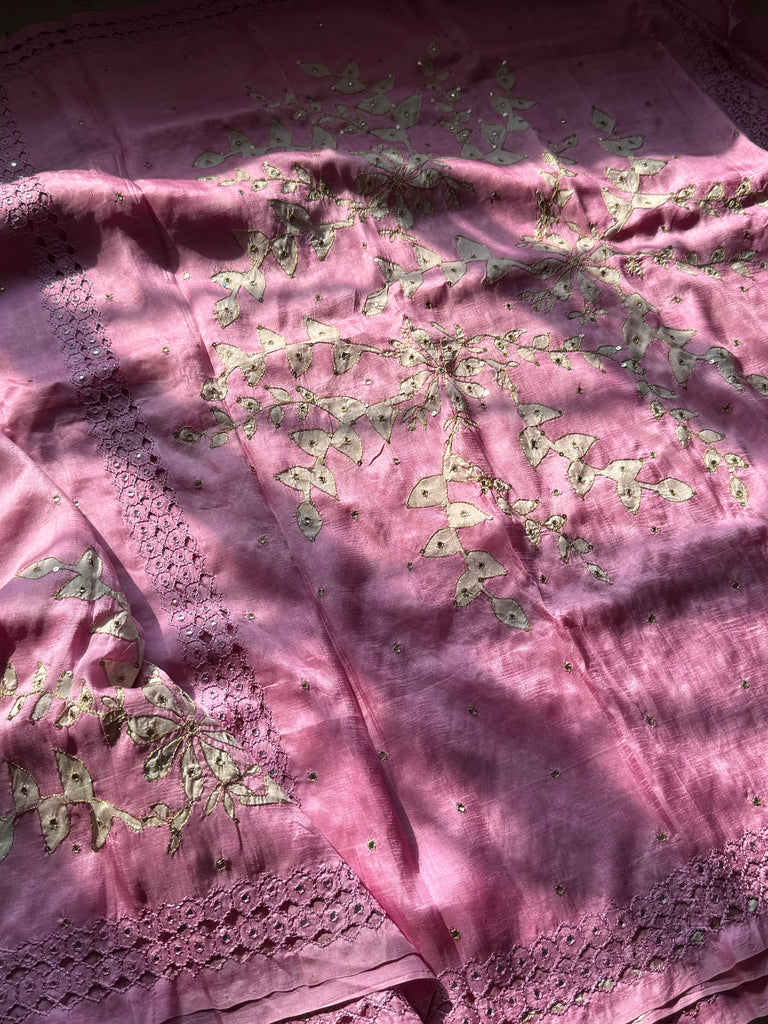 The pallu is where the artistry truly blooms — framed with intricate cutwork on all four sides and filled with intricately embroidered floral motifs, thoughtfully layered with mirror work, sequins, and fine thread embroidery.