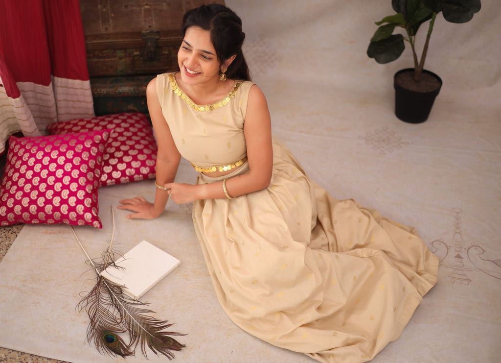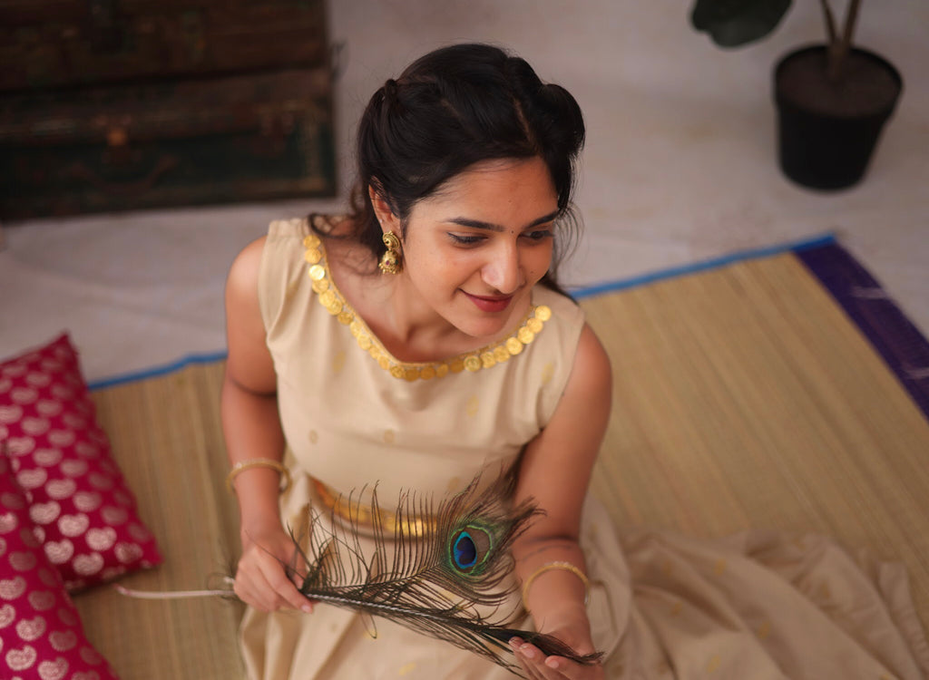 Experience the exquisite craftsmanship with our Aabarna crop top and skirt set. Made with raw silk material and adorned with kaasumaala and hip belt handcrafts, this ornamental collection also features stunning golden zari buttas. Perfect for onam and traditional festivals.