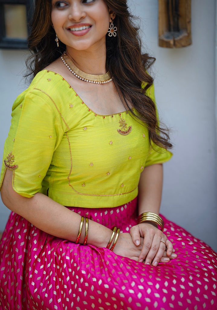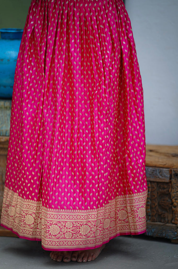 The pleated skirt is tailored from luxurious Banarasi silk, featuring delicate zari buttas woven across the body and a traditionally inspired border that enhances its regal appeal. Rich in texture and timeless in design, this ensemble is perfect for festive occasions and grand celebrations.