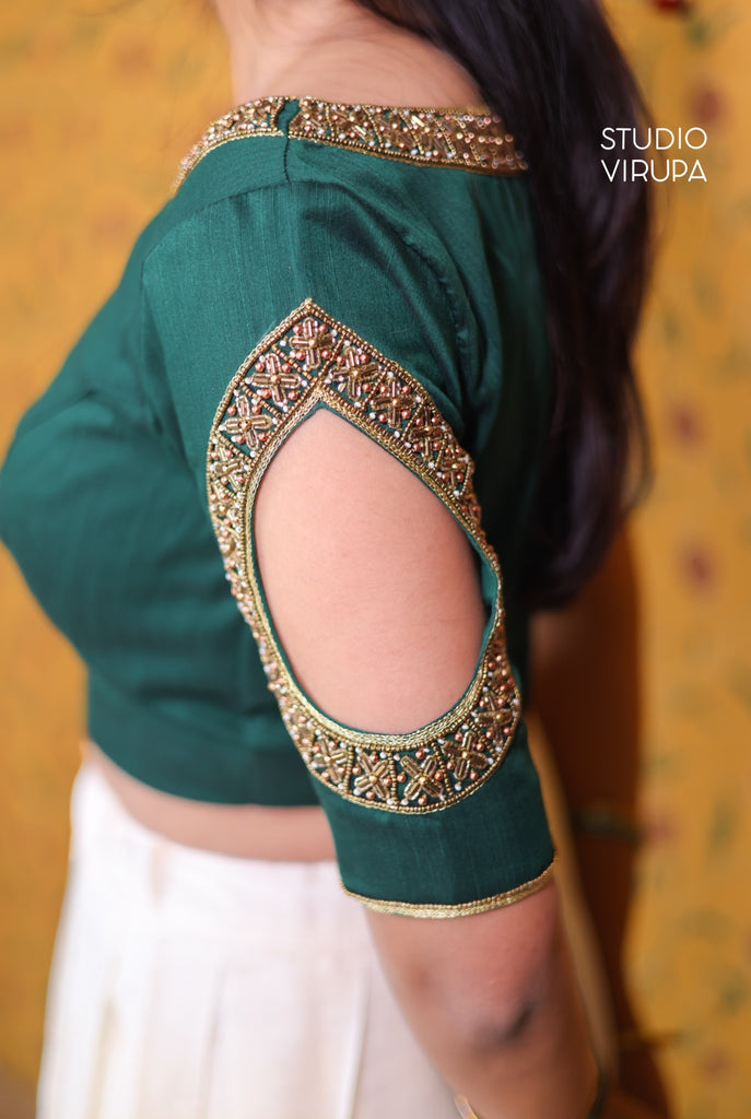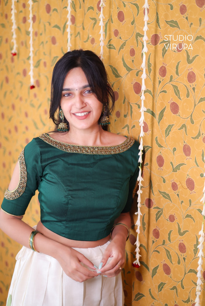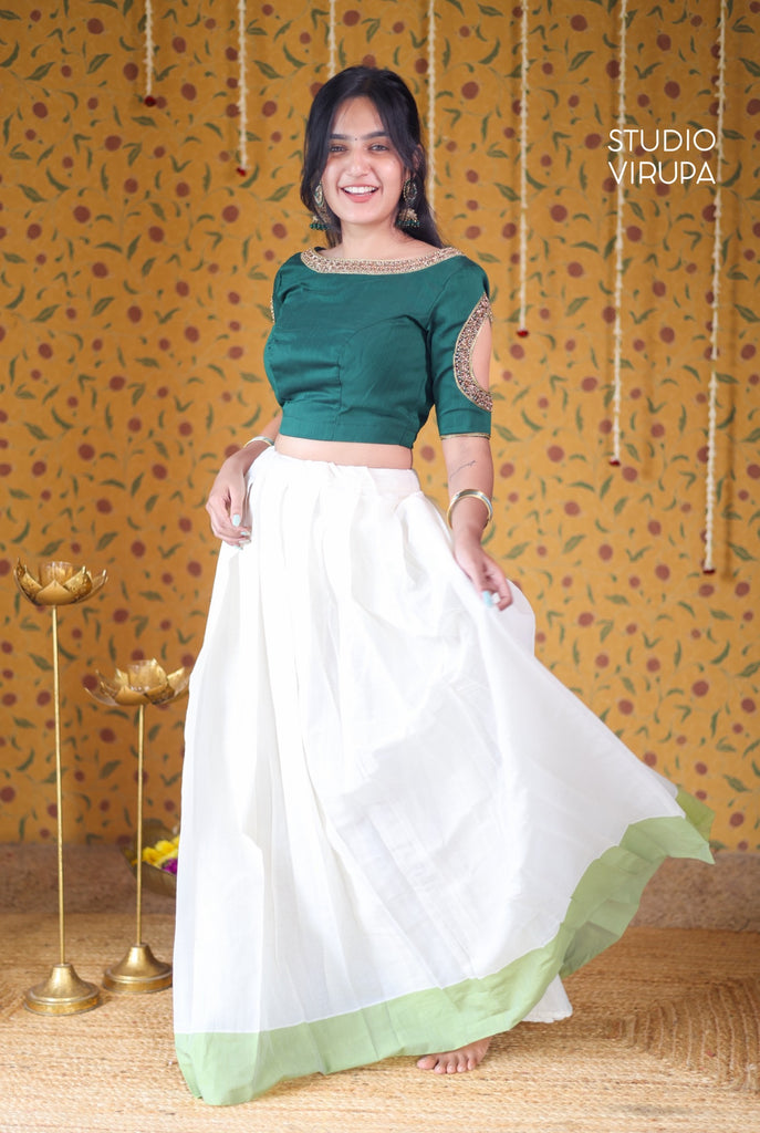 Indulge in luxury with our Anshi Crop Top and Skirt set. Made from raw silk, the green crop top features exquisite aari work embroidery for a touch of elegance. Paired with a flowing white cotton skirt, this set is perfect for any occasion and will make you feel effortlessly chic. Elevate your wardrobe with this premium ensemble.