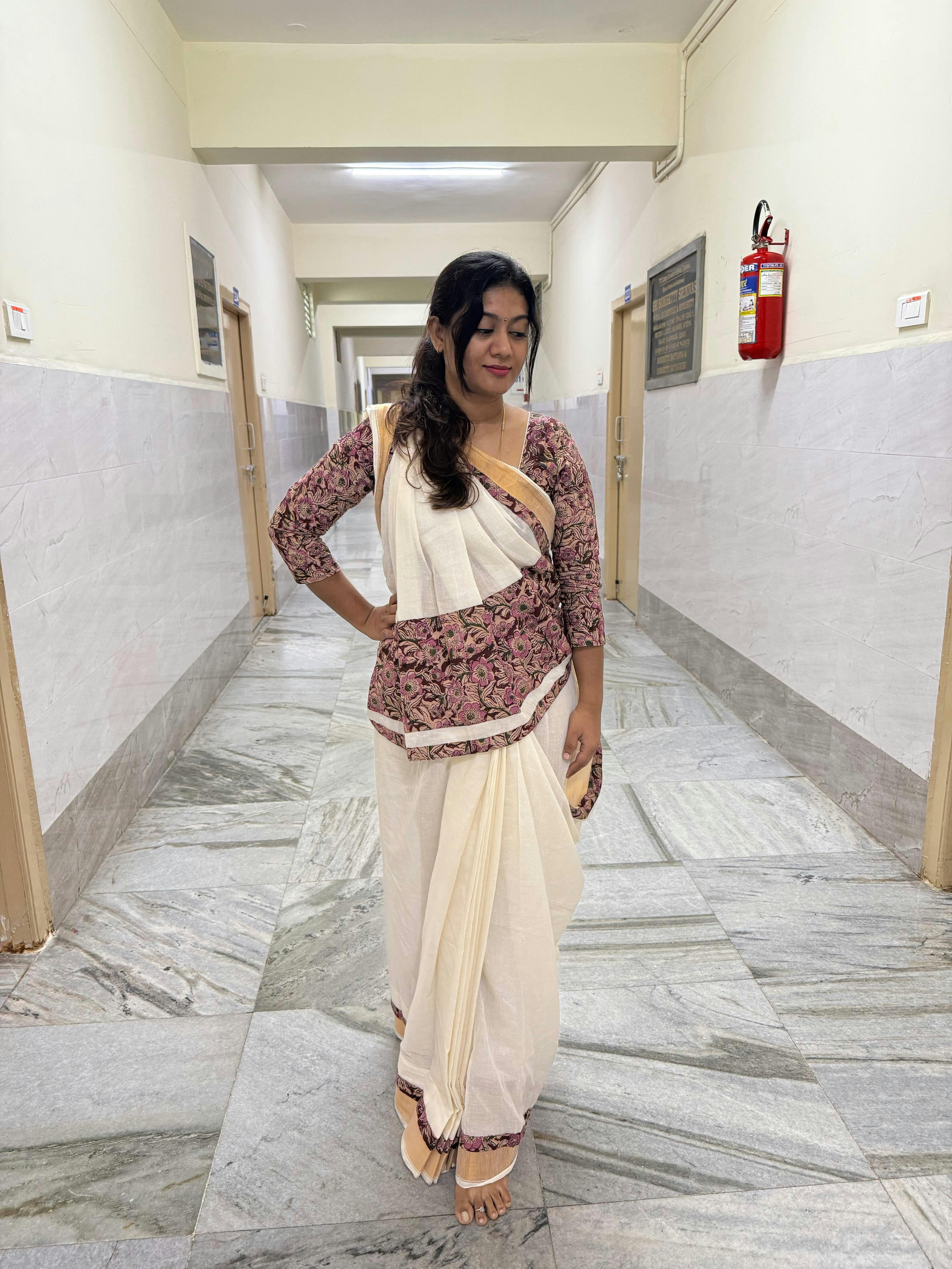 Loved the saree and the fit of the stitched blouse was amazing.. but i found only one flaw, i ordered a pre draped saree and the pallu was a bit short.. so i had styled it accordingly.. I’m posting a picture too.. still i loved the saree and the blouse !