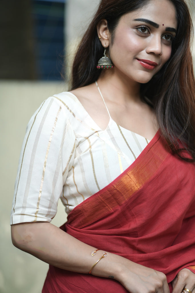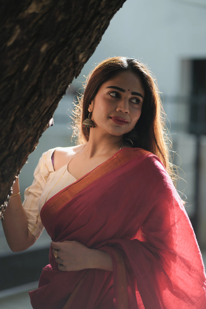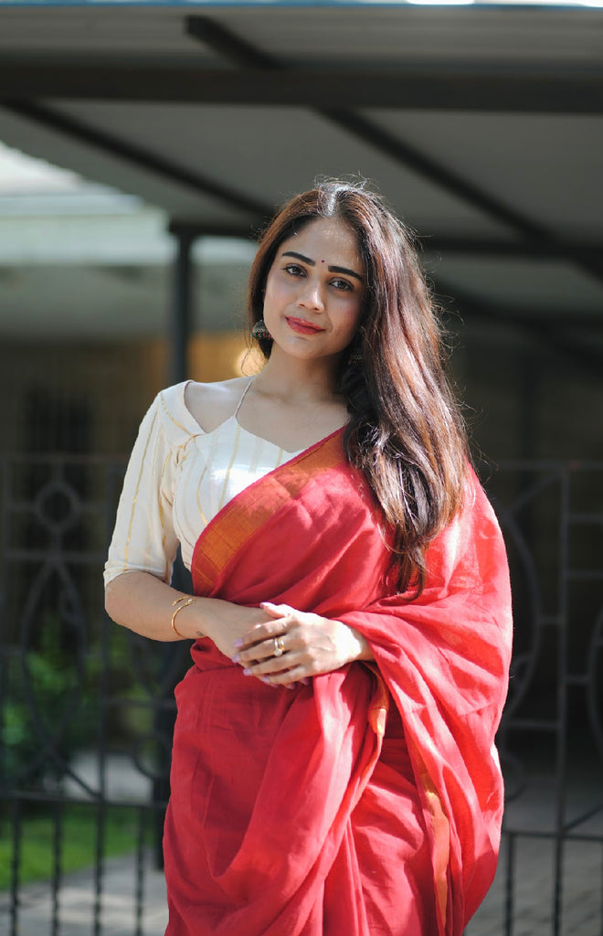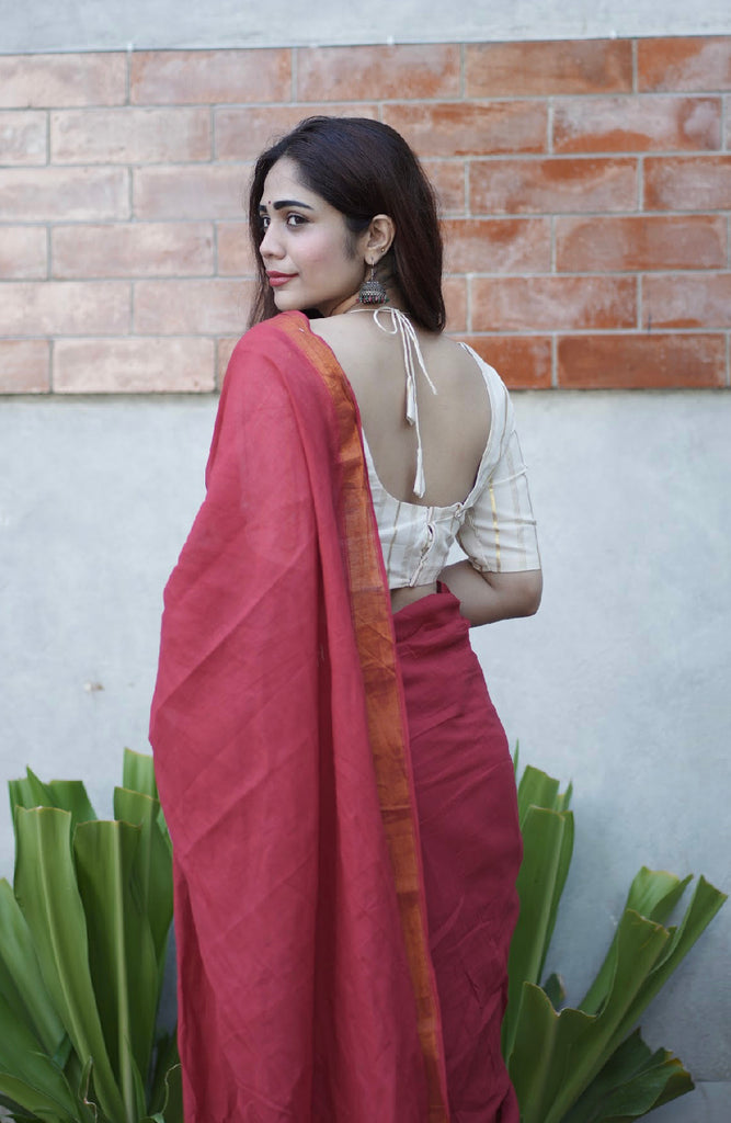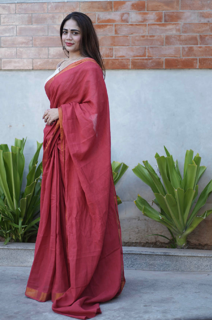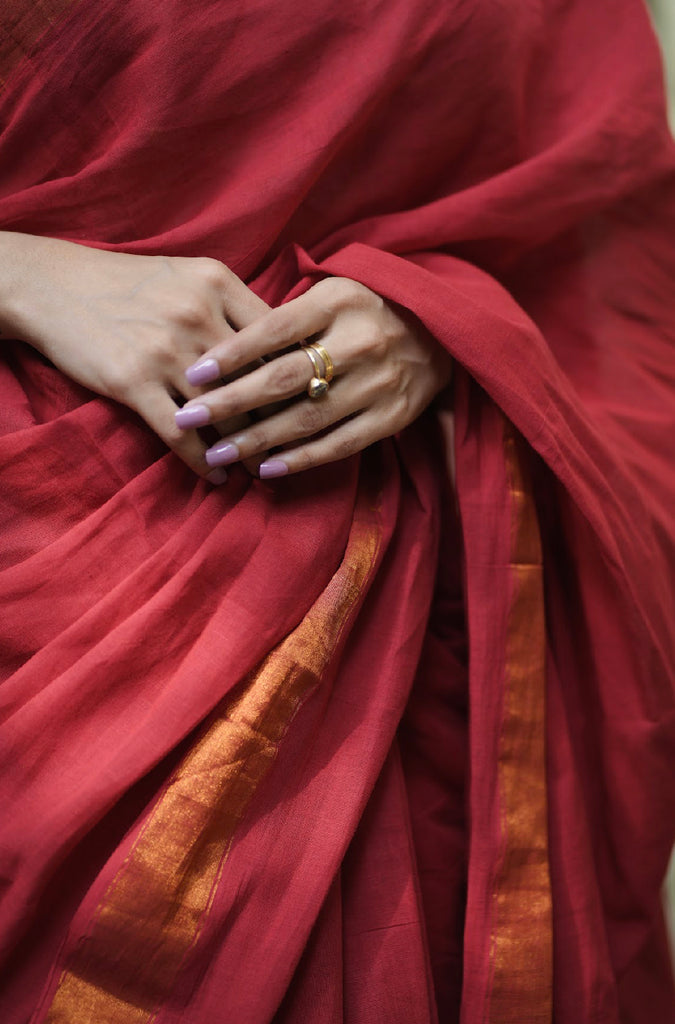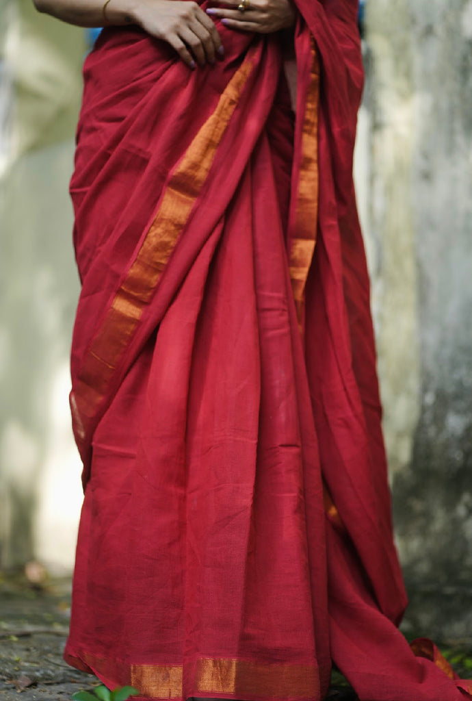This 100% pure cotton red saree is the perfect blend of comfort and tradition. It features a classic golden border that adds a touch of festive elegance to its vibrant hue.
