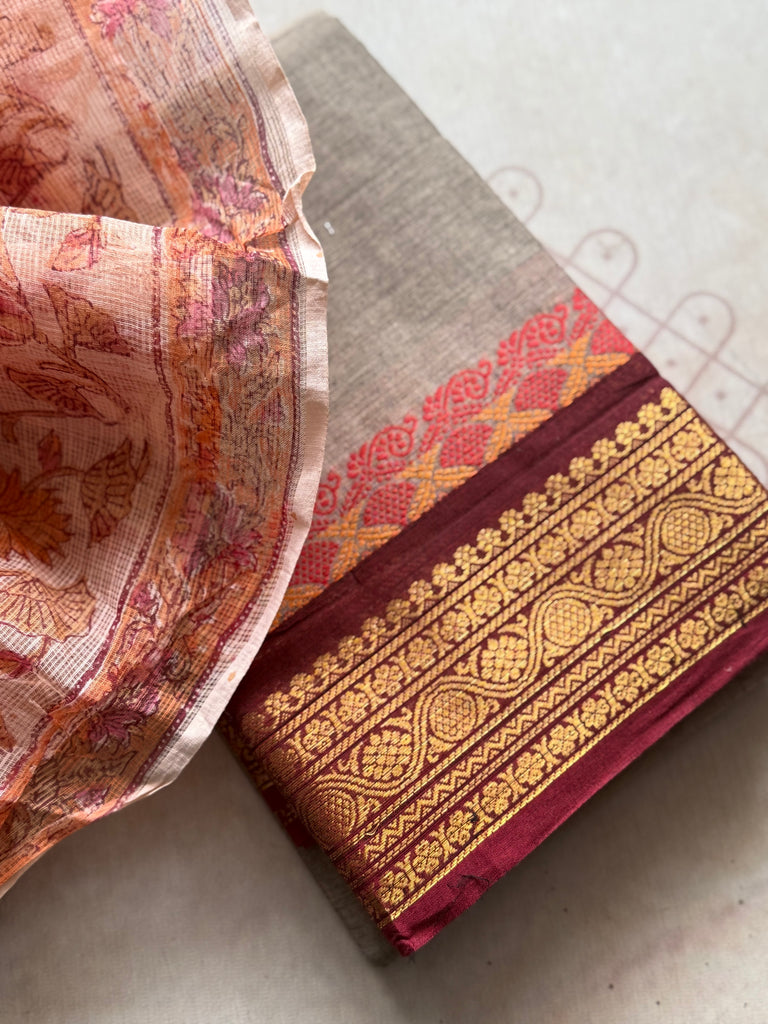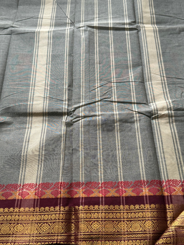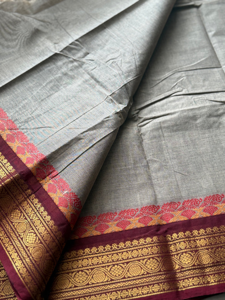 Chettinad Cotton in a beautiful shade of grey with Zari detailed Border & Pallu is a must-have in your closet!!
