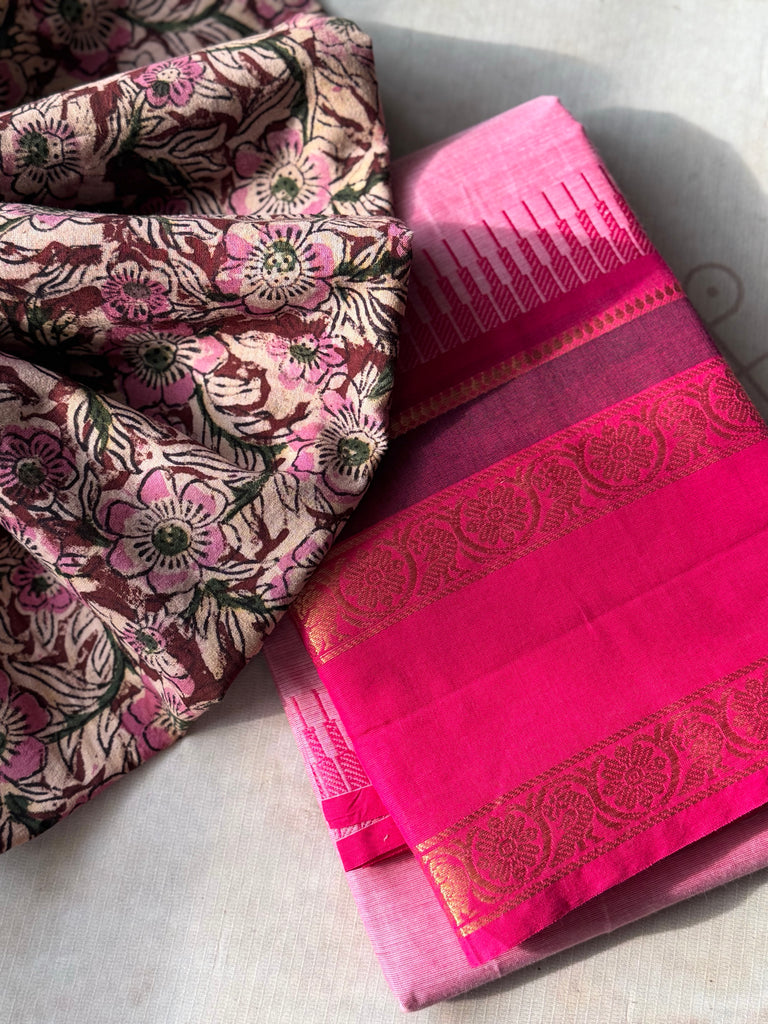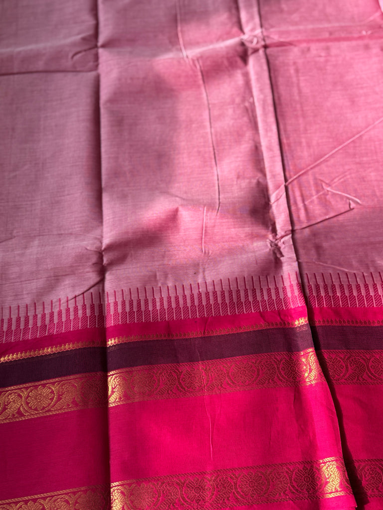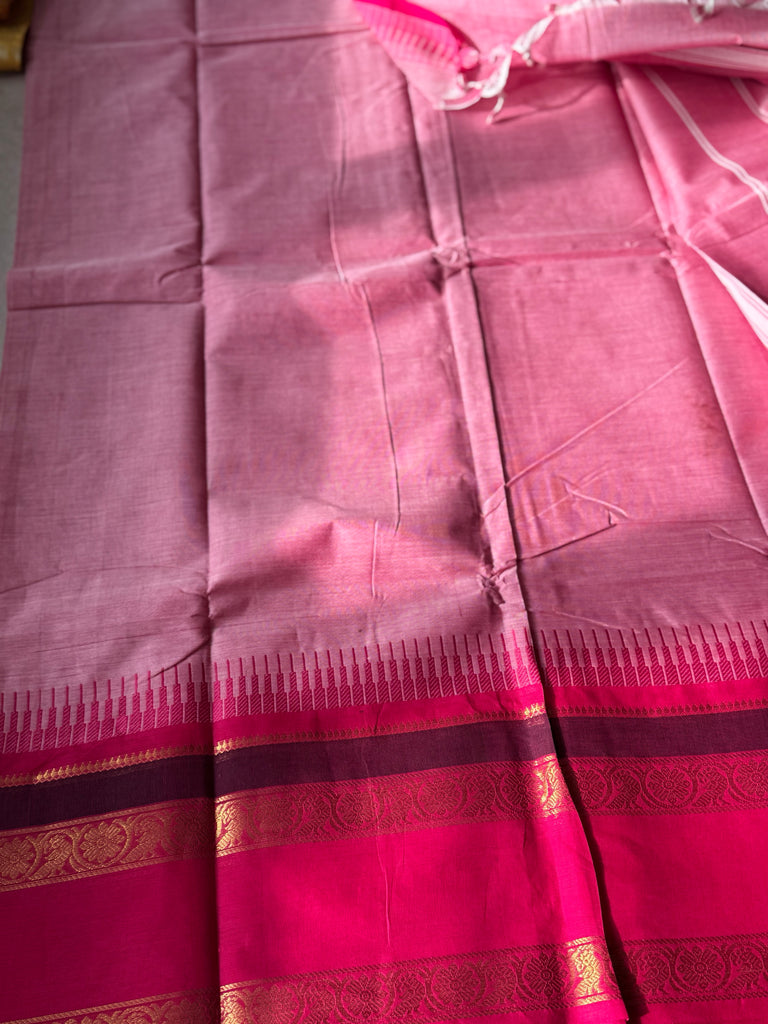 A chic blend of tradition and modern grace, this baby pink-toned Chettinad cotton saree is adorned with a contrasting hot pink temple border that instantly adds vibrance to the drape. The subtle body beautifully balances the intricately woven border, making it versatile for both casual elegance and festive sophistication.