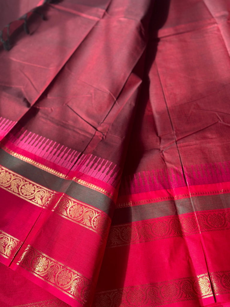This elegant cream-toned Chettinad cotton saree beautifully blends subtle charm with striking contrasts. The drape is elevated by a traditional temple border in a refreshing grey hue, adding vibrancy against the calm grey body. To enhance its appeal, the selvedge is highlighted with a contrasting hot pink shade, giving the saree a unique, eye-catching edge.