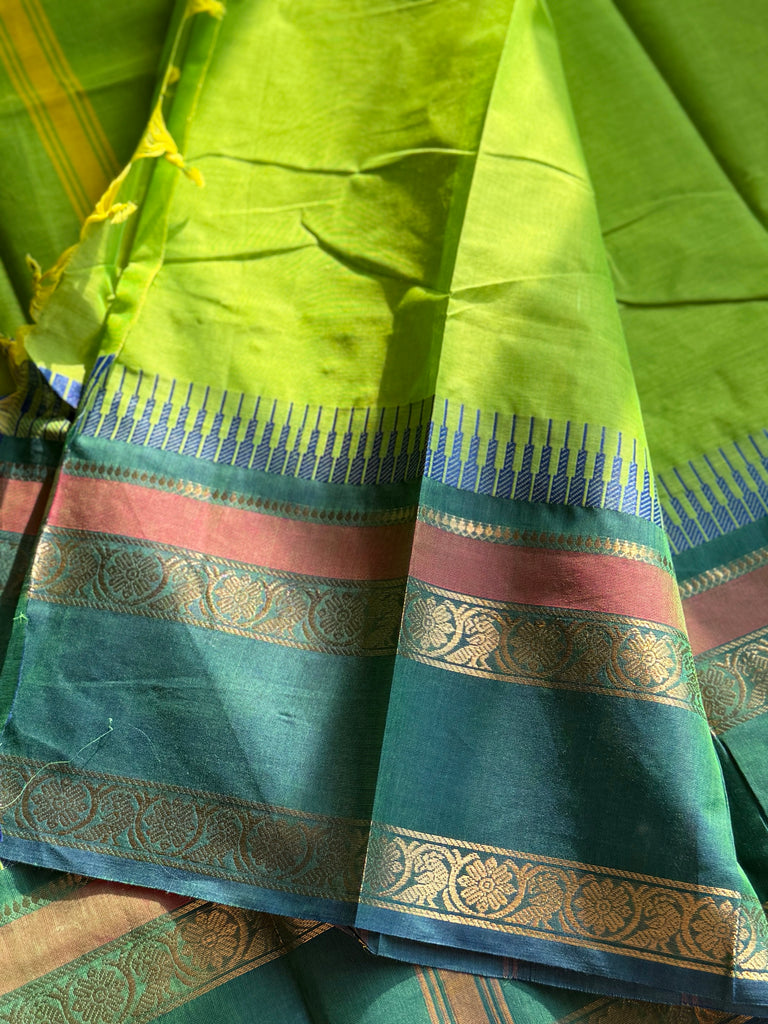 A chic blend of tradition and modern grace, this light green Chettinad cotton saree is adorned with a contrasting blue temple border that instantly adds vibrance to the drape. The subtle body beautifully balances the intricately woven border, making it versatile for both casual elegance and festive sophistication.