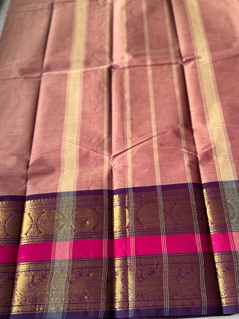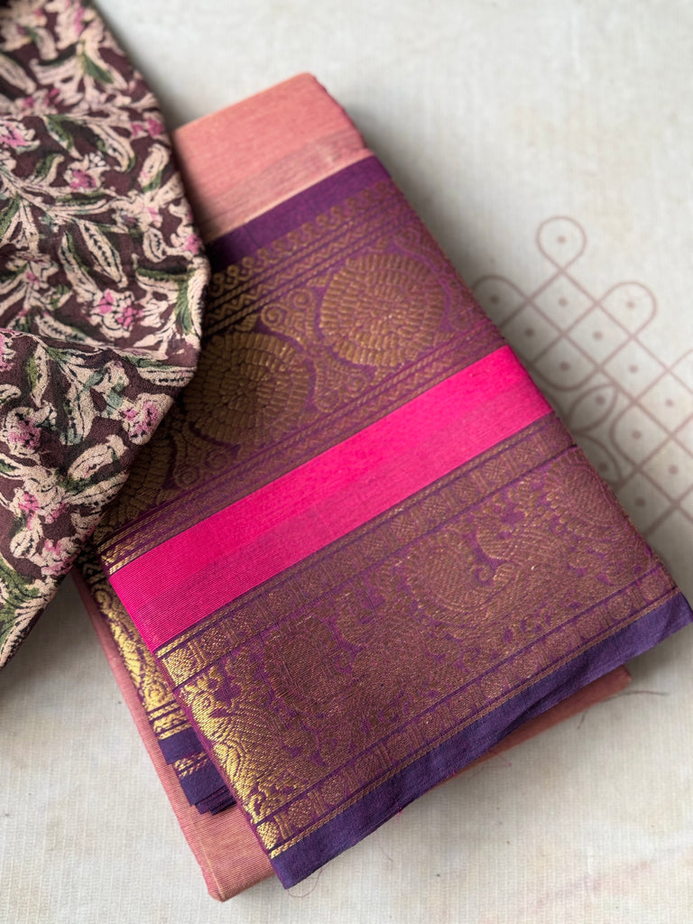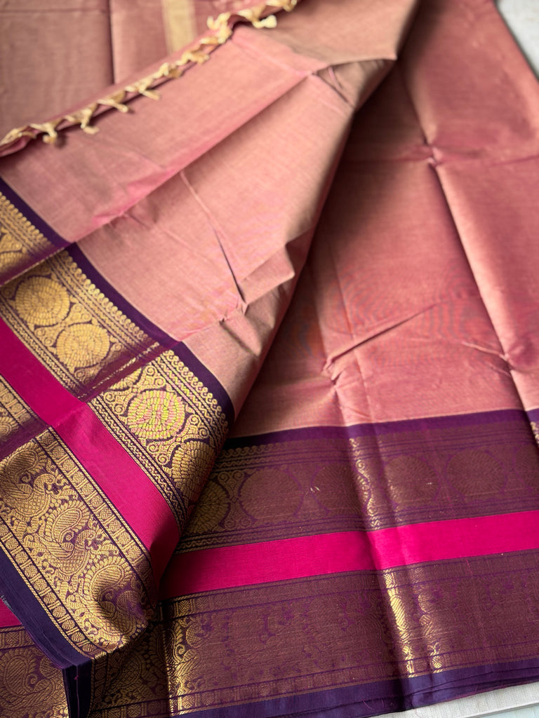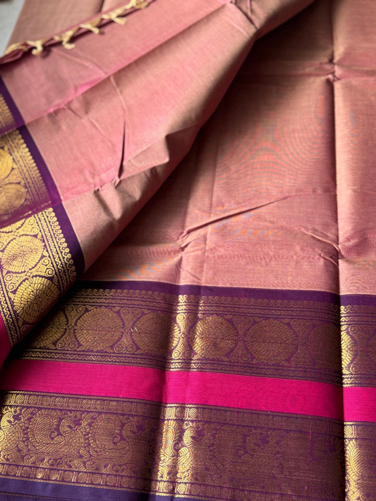 A chic blend of tradition and modern grace, this wind rose -toned Chettinad cotton saree is adorned with a contrasting traditional border that instantly adds vibrance to the drape. The subtle body beautifully balances the intricately woven border, making it versatile for both casual elegance and festive sophistication.