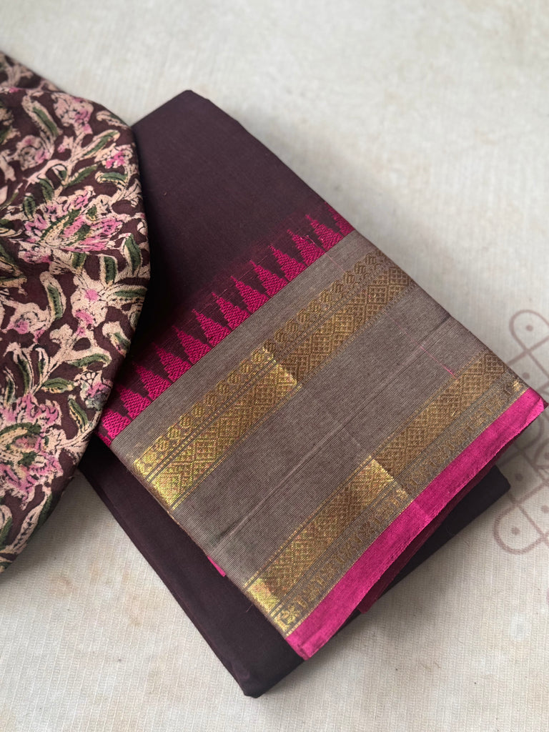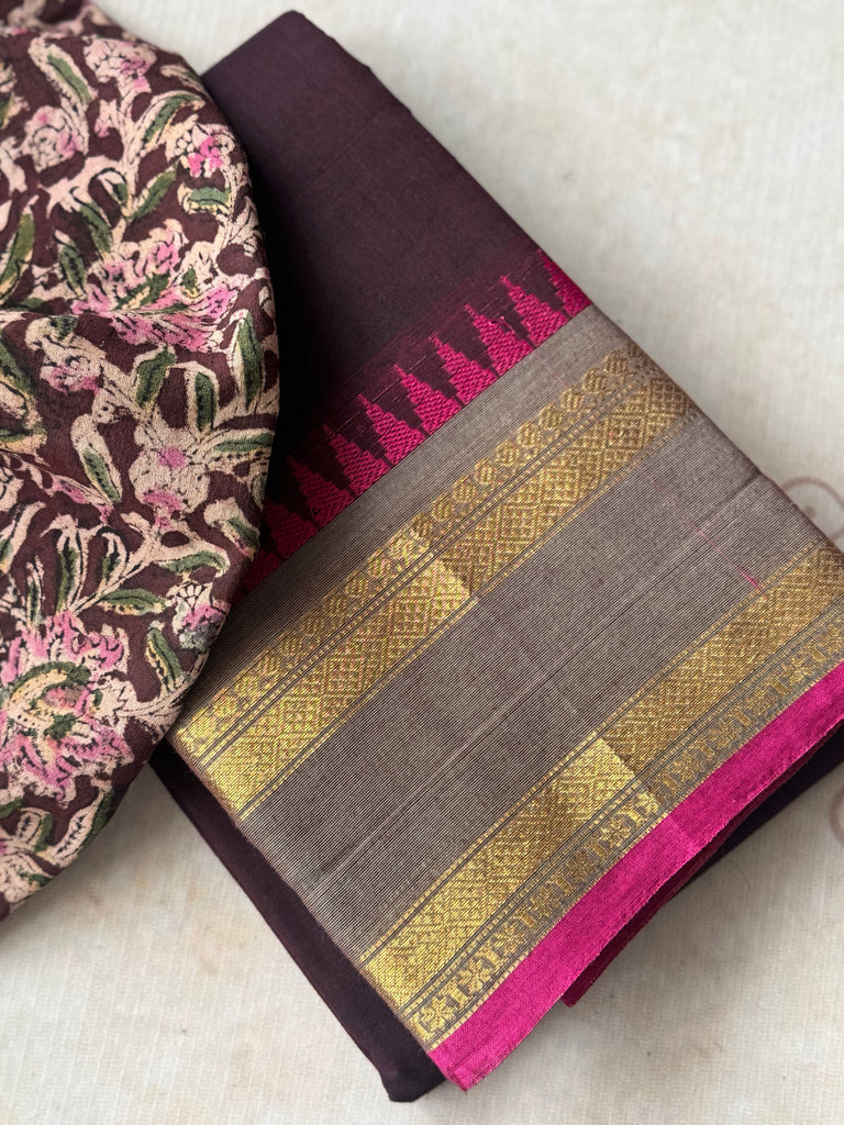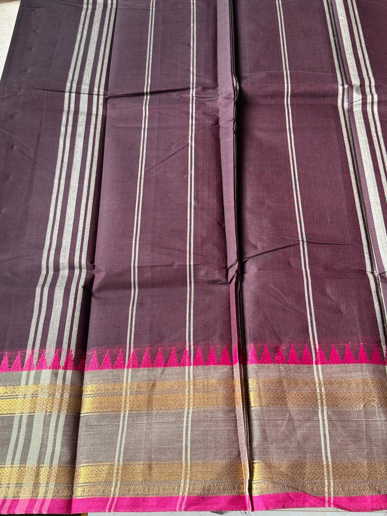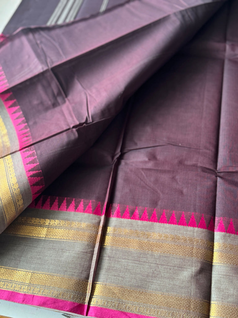 A chic blend of tradition and modern grace, this deep purple -toned Chettinad cotton saree is adorned with a contrasting grey with pink temple border that instantly adds vibrance to the drape. The subtle body beautifully balances the intricately woven border, making it versatile for both casual elegance and festive sophistication.