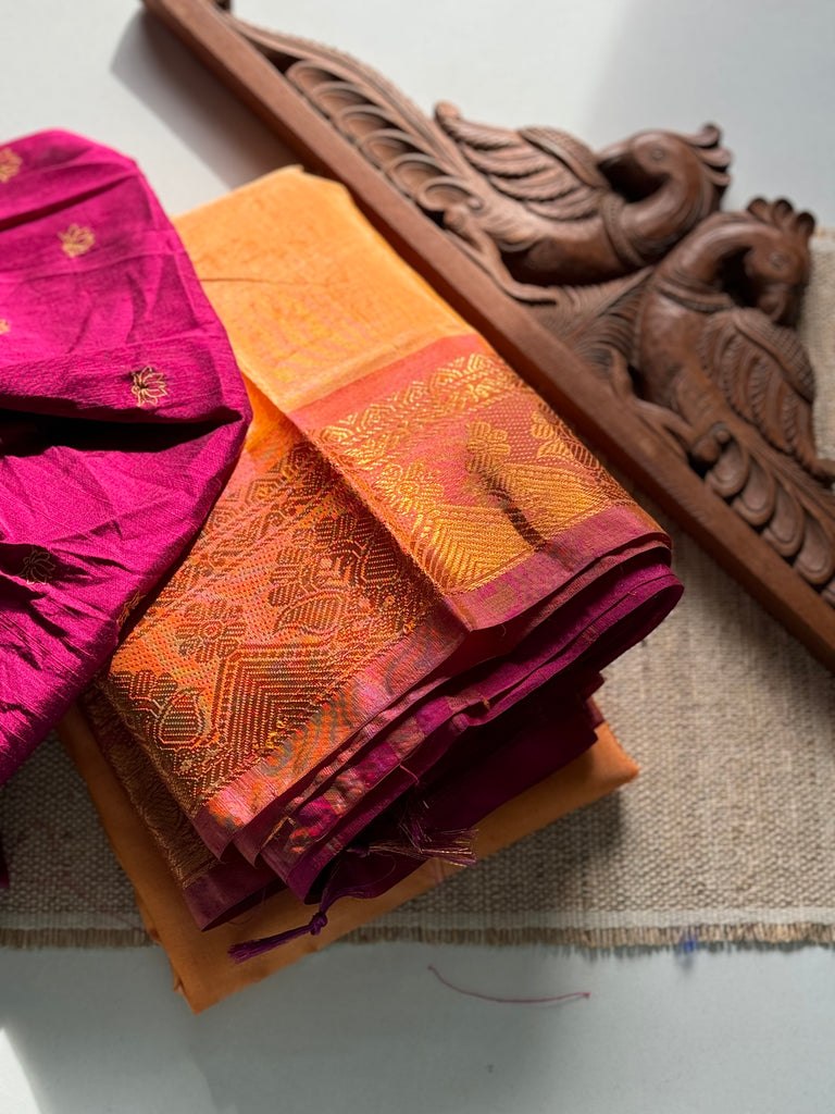 Madurai Pattu in a beautiful shade of Orange and pink border with pink  pallu is a must-have in your wardrobe!