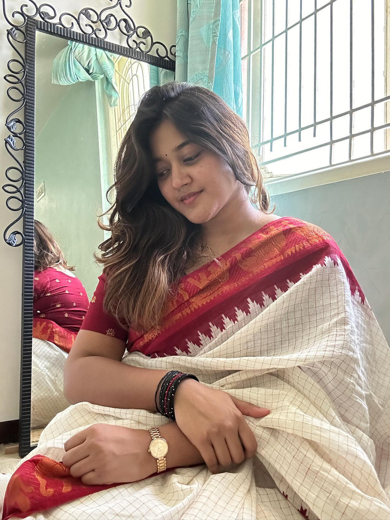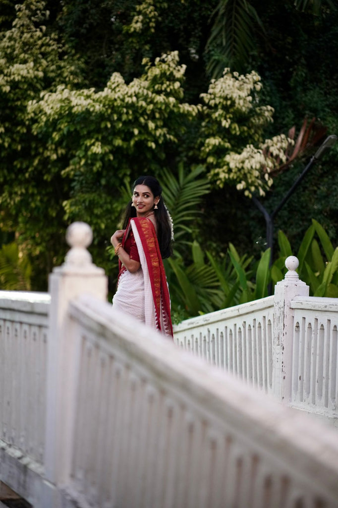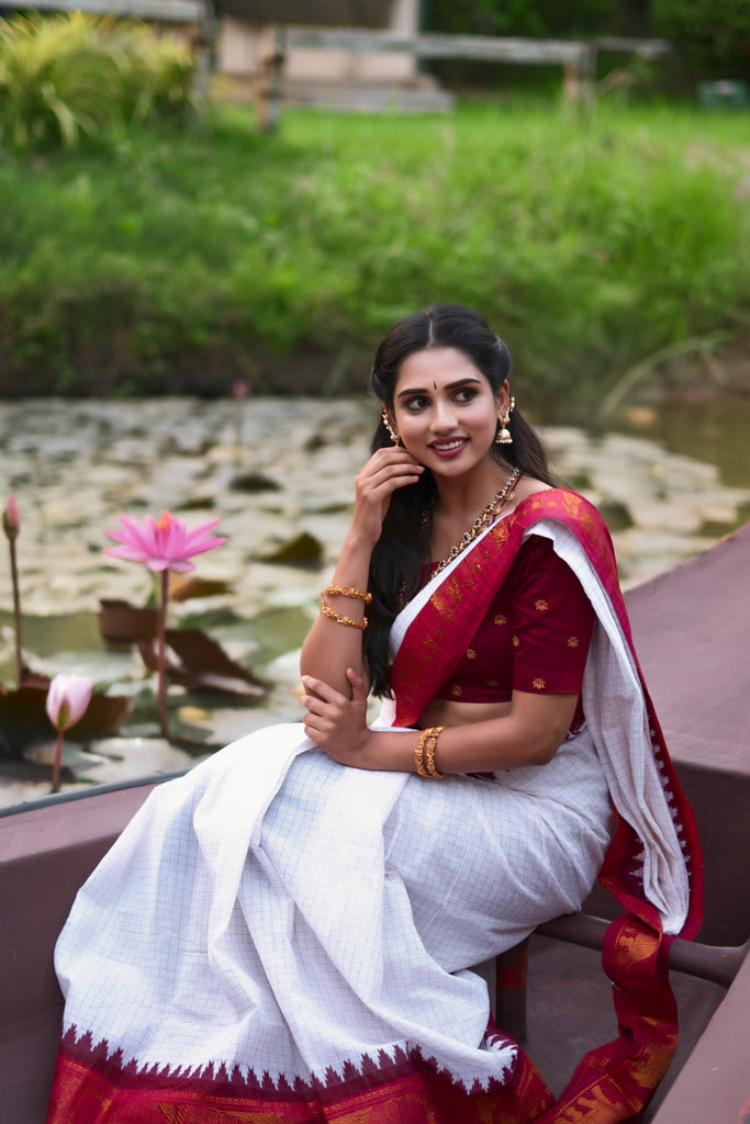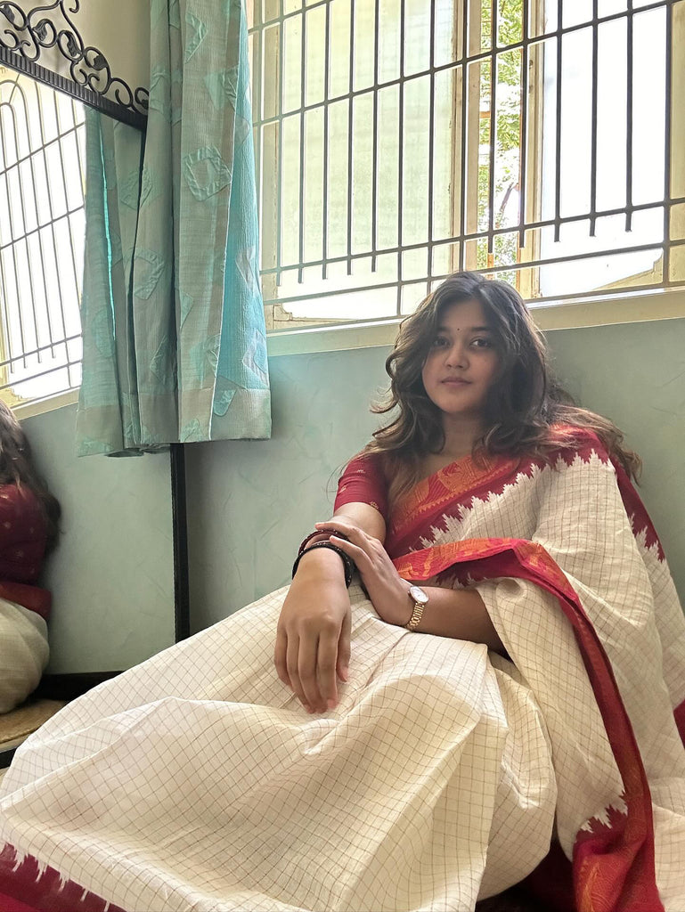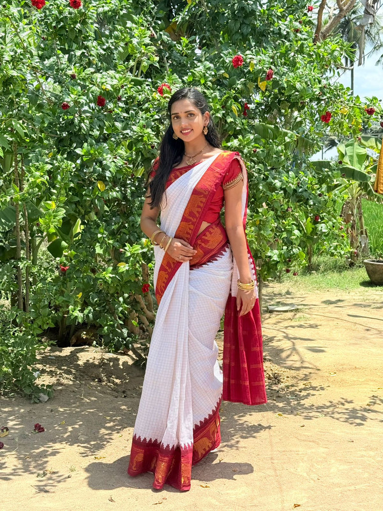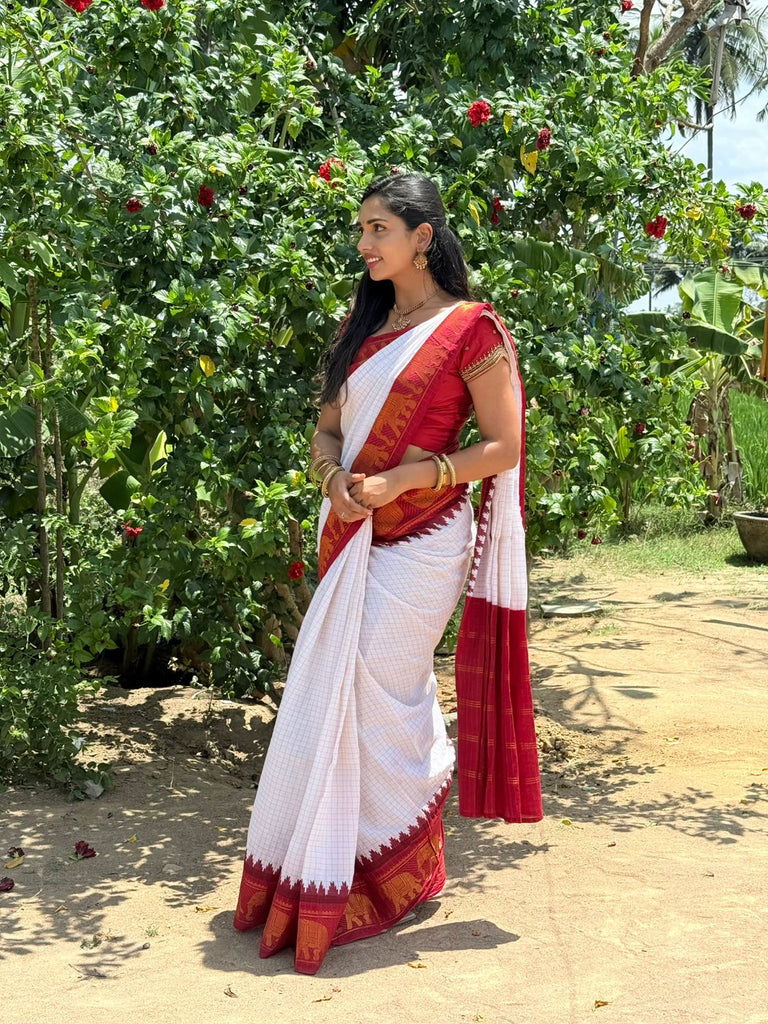 Madurai Sungudi Cotton Zari Kattam in a Beautiful shade of White and Red detailed with Zari checkered body and Zari detailed contrast Red Border and Pallu.
