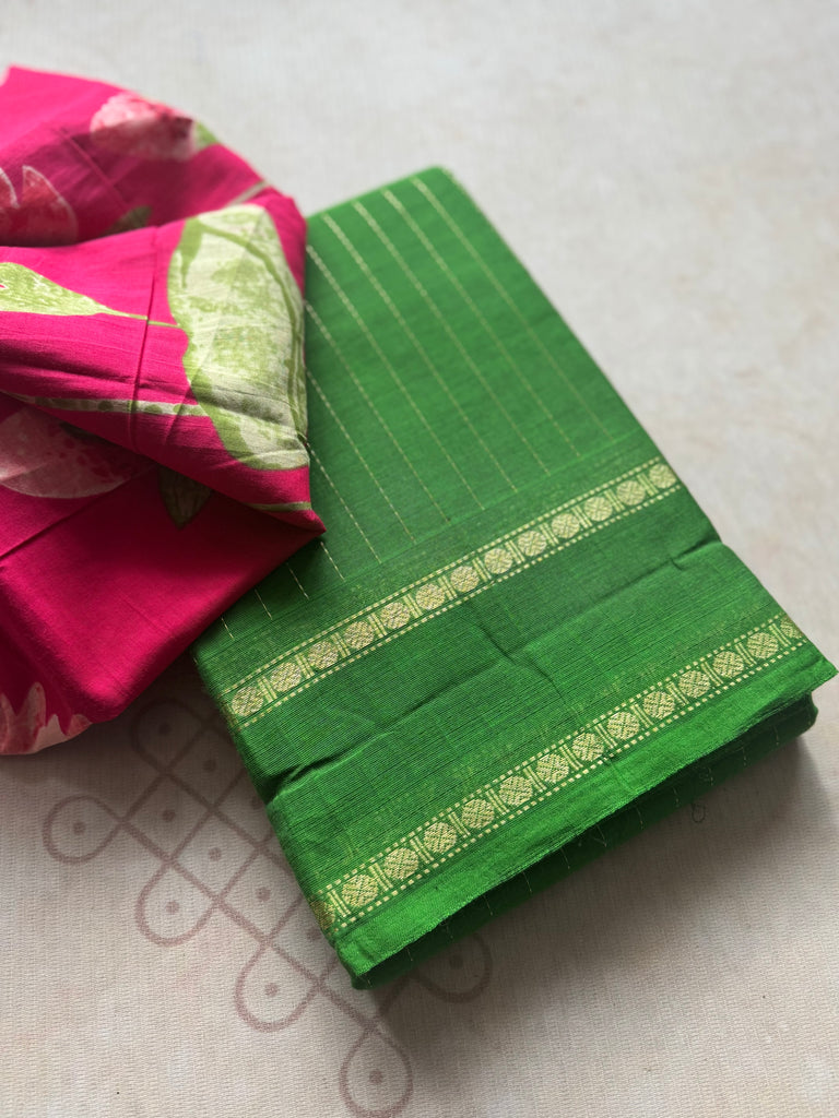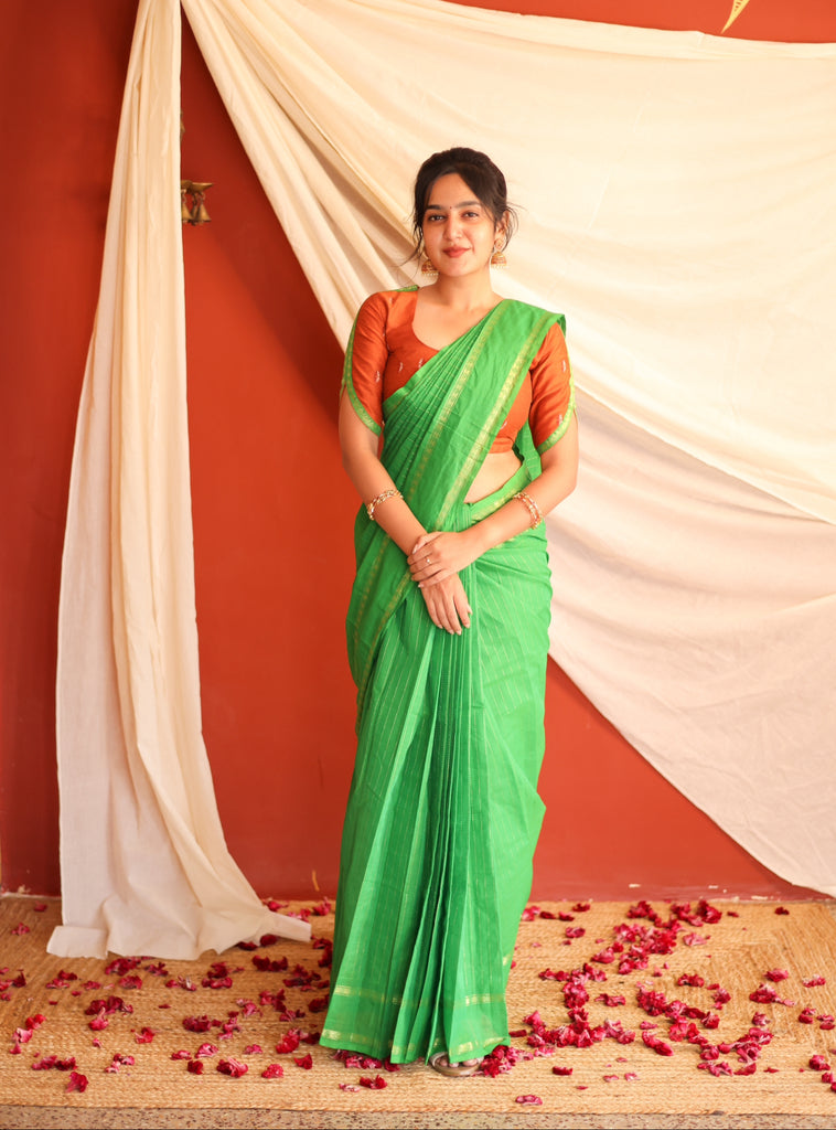 Crafted with precision and expertise, the Kamakshi - Kanchi Cotton saree exudes elegance. Made from authentic Kanchi cotton, this saree features intricate zari lines that add a touch of glamour. Perfect for any occasion, this saree combines traditional craftsmanship with modern style. Own a piece of timeless art with Kamakshi.