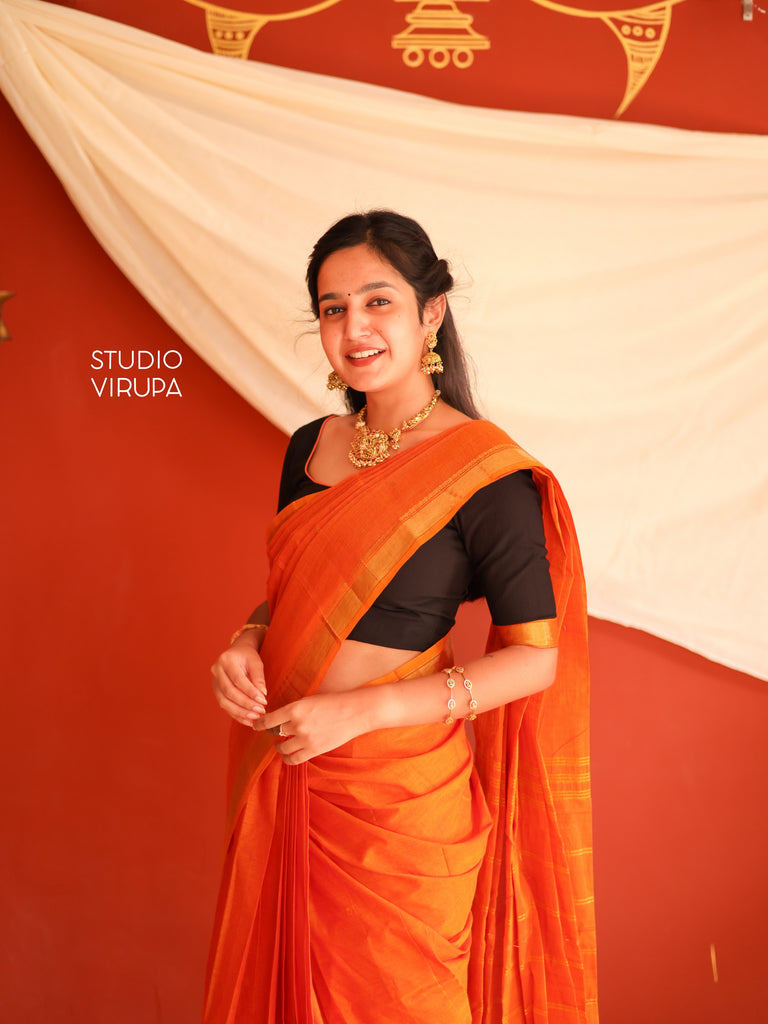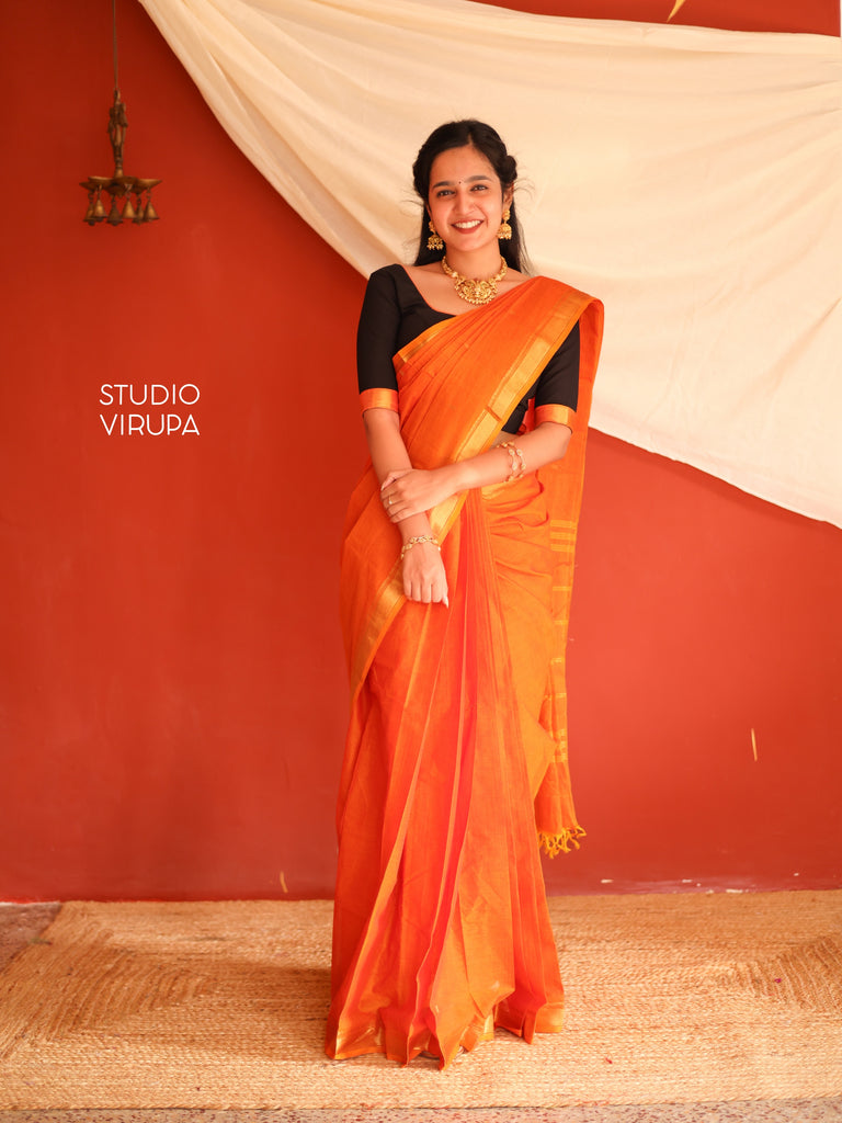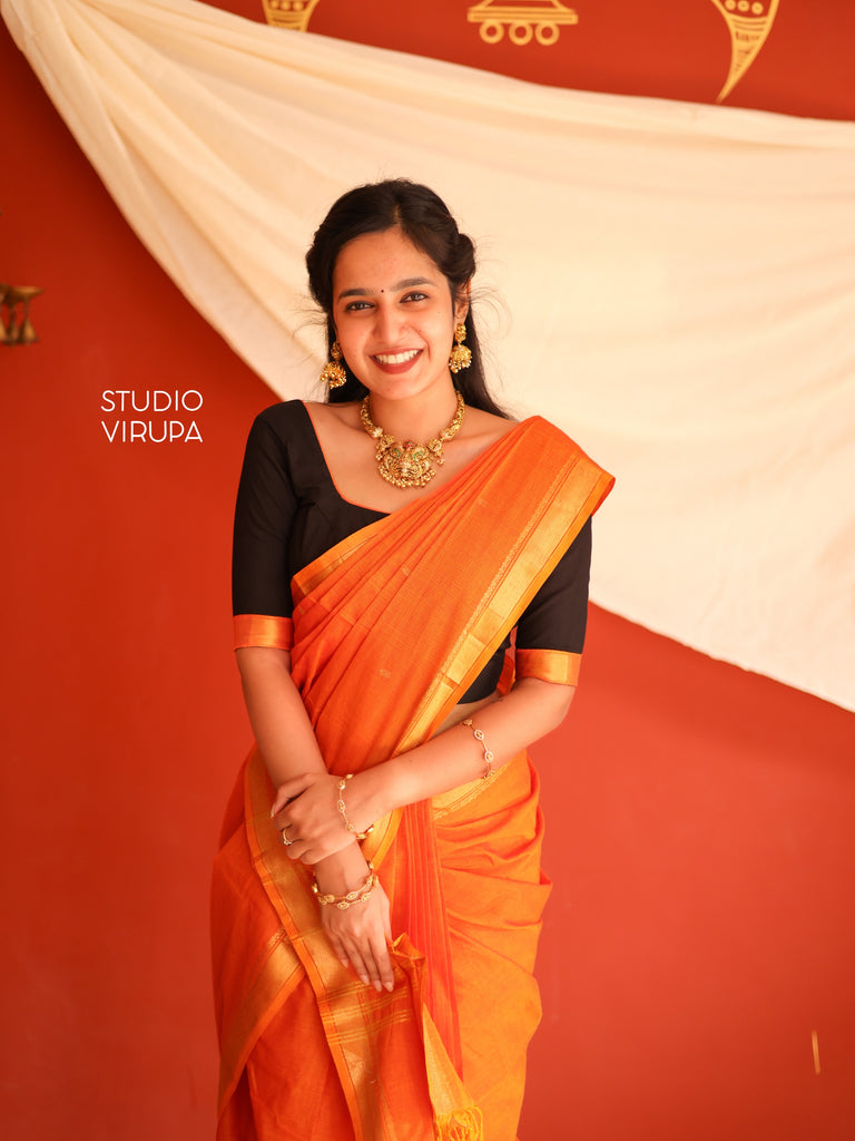 Elevate your saree game with our exquisite Kamakshi - Kanchi Cotton in Orange which boasts a beautiful gold zari border and pallu, adorned with traditional buttas. Perfect for any occasion, this saree is a must-have for any wardrobe! Comes with running blouse fabric as well as contrast black blouse fabric.
