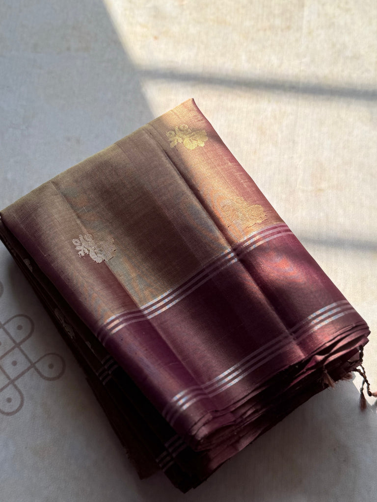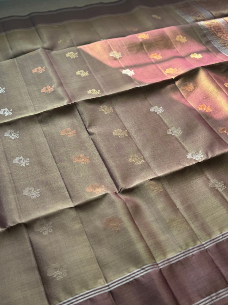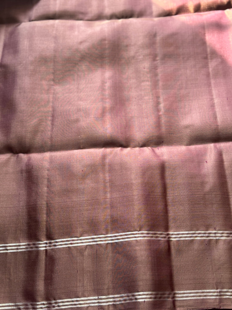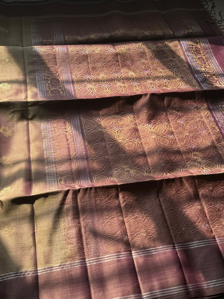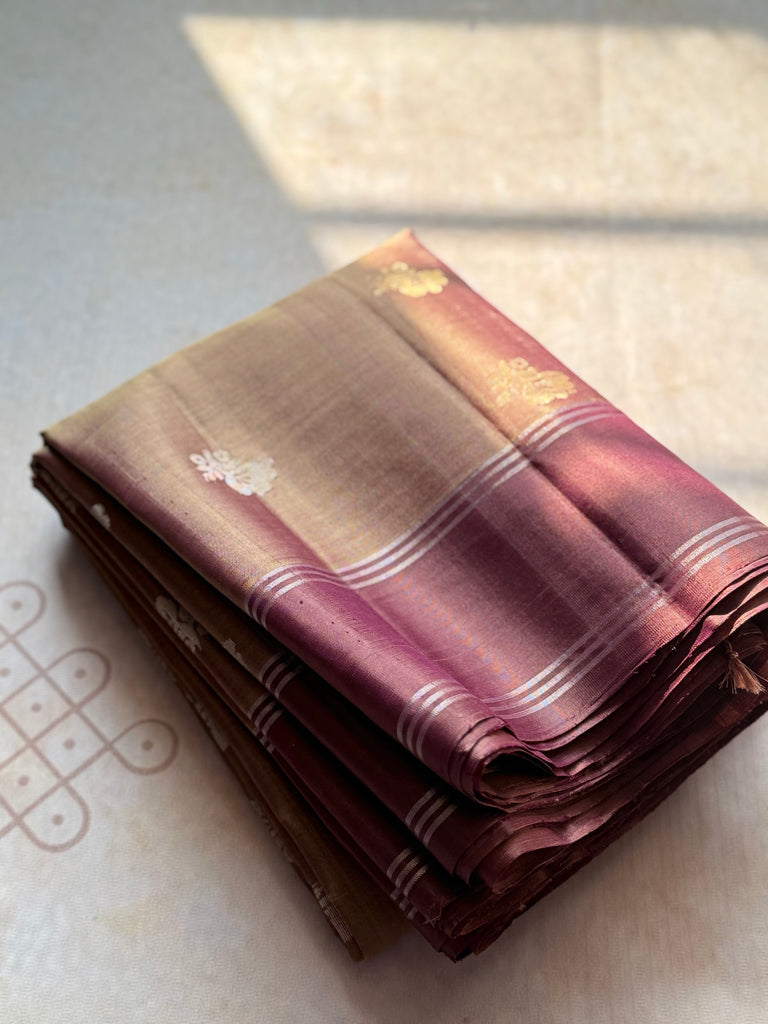 Experience the elegance and luxury of our Kanjivaram Pure Soft Silk Saree. Handmade with intricate zari buttas and a heavy zari designed pallu, this saree features a beautiful copper colour with dark chocolate accents. The traditional plain border adds a touch of sophistication. Includes one meter blouse for a complete look.