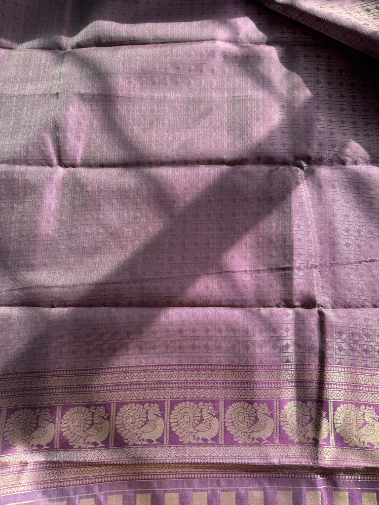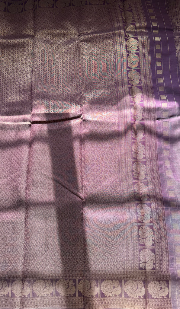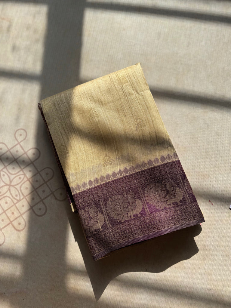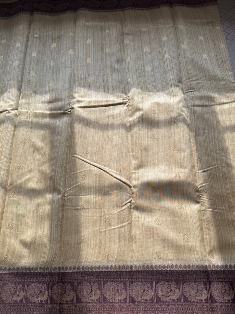 This semi jute saree strikes the perfect balance between subtlety and grandeur. The body features delicate golden zari buttas scattered all over, lending a graceful shimmer without overpowering the look. Its contrasting violet border showcases intricate traditional peacock motifs woven in zari, adding a touch of heritage charm.