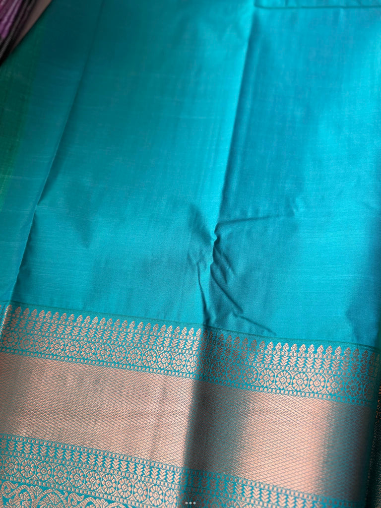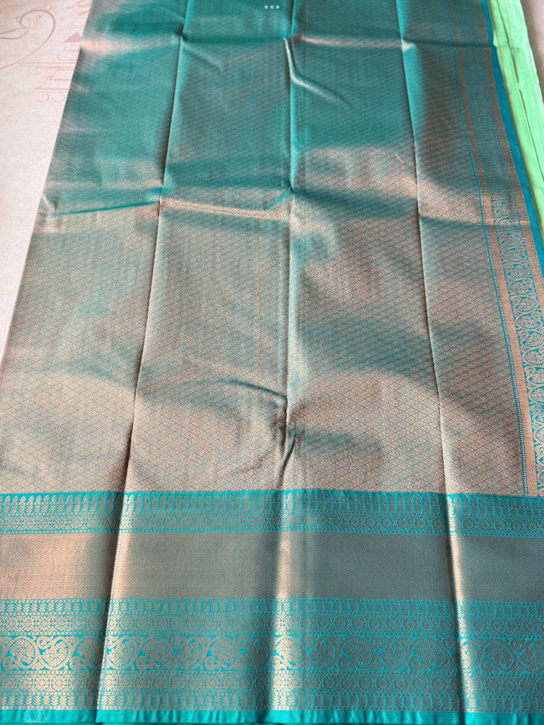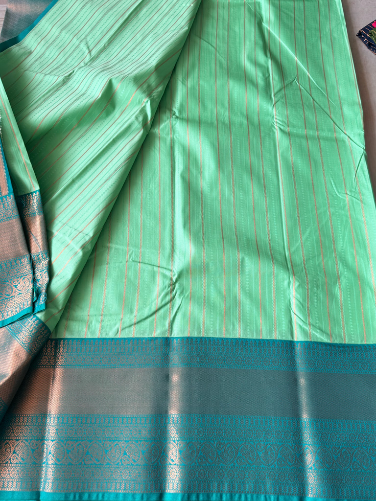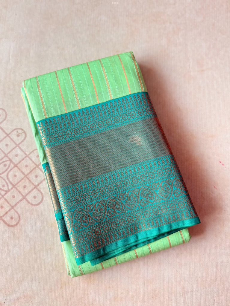 Bring festive charm to your wardrobe with this stunning semi Kanchi silk saree. The body is adorned in a pista base, decorated with delicate zari buttas that add subtle sparkle and elegance. The zari border is astonishing with the traditional gold zari detailing.