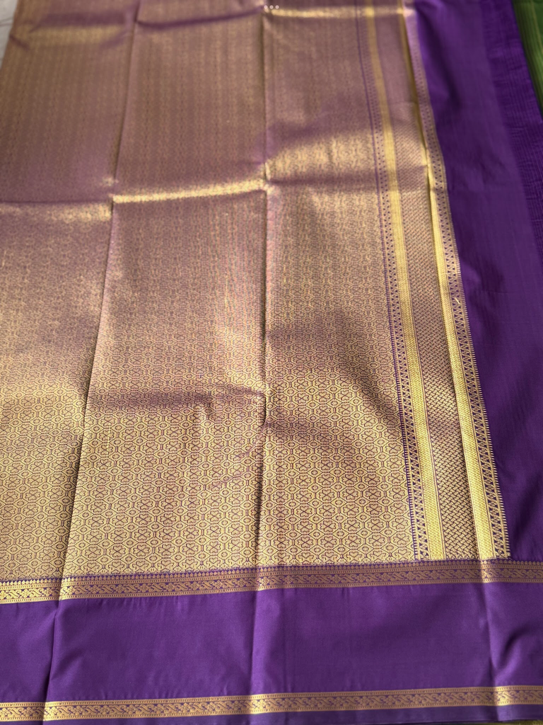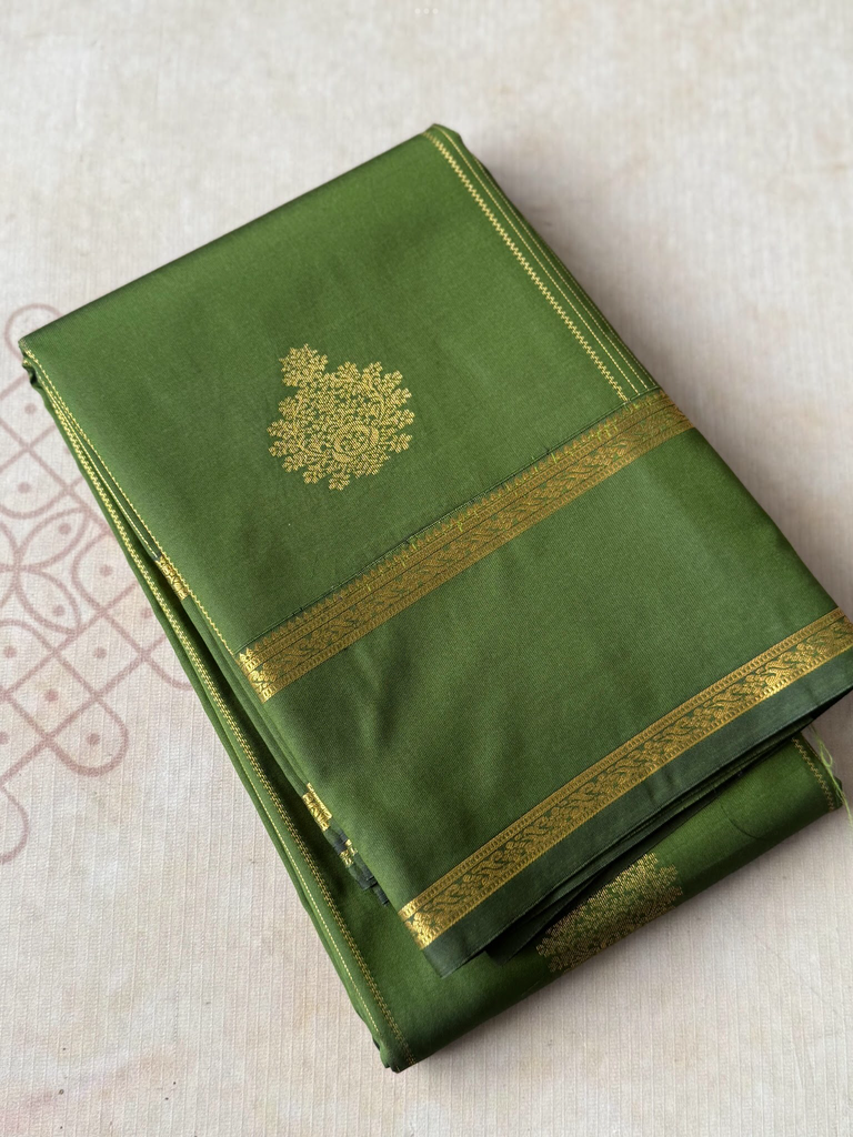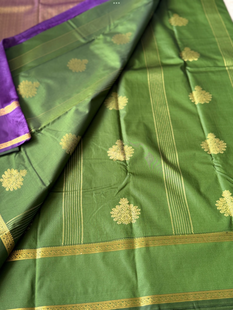 Bring festive charm to your wardrobe with this stunning semi Kanchi silk saree. The body is adorned in a Grass green base, decorated with delicate zari buttas that add subtle sparkle and elegance. The traditional zari woven border is astonishing with the traditional gold zari detailing.