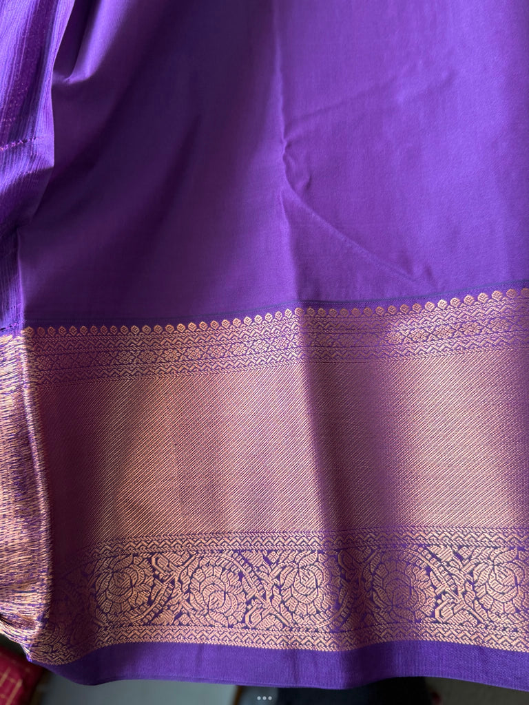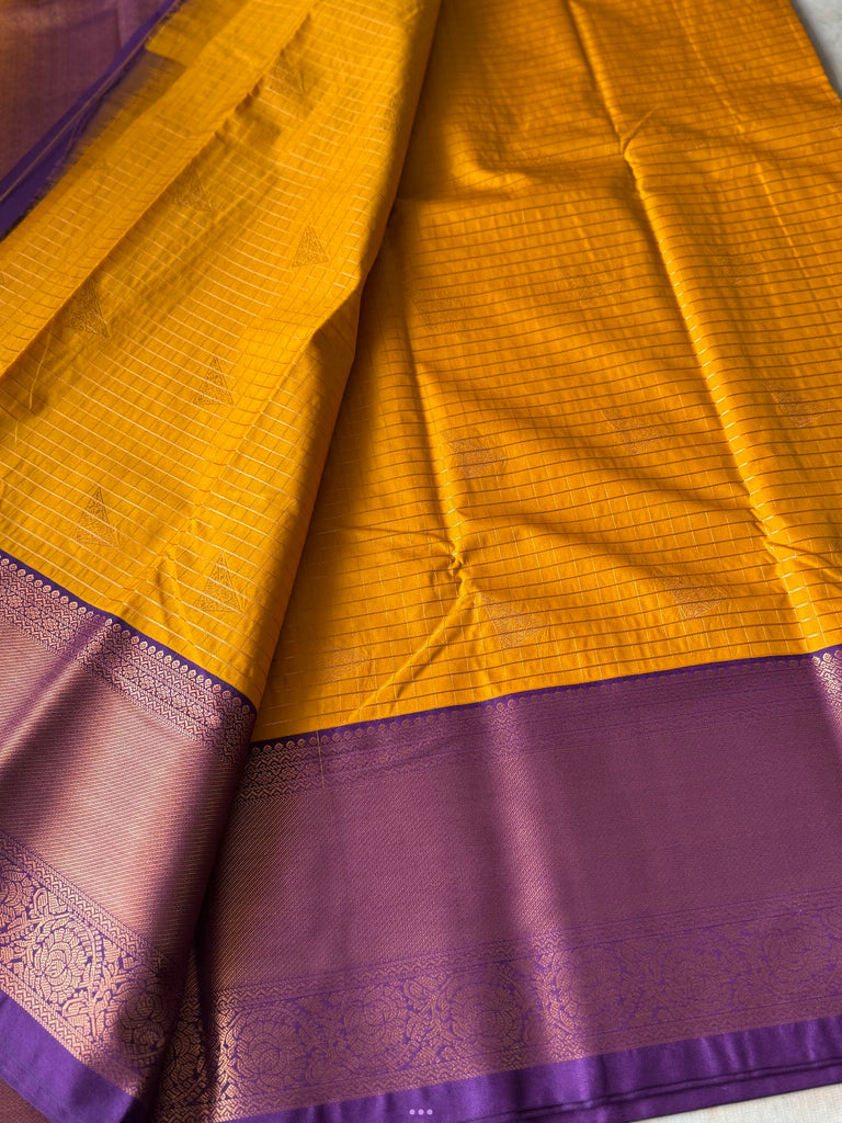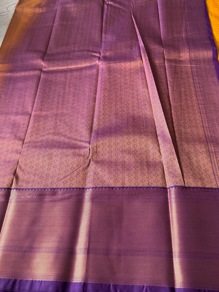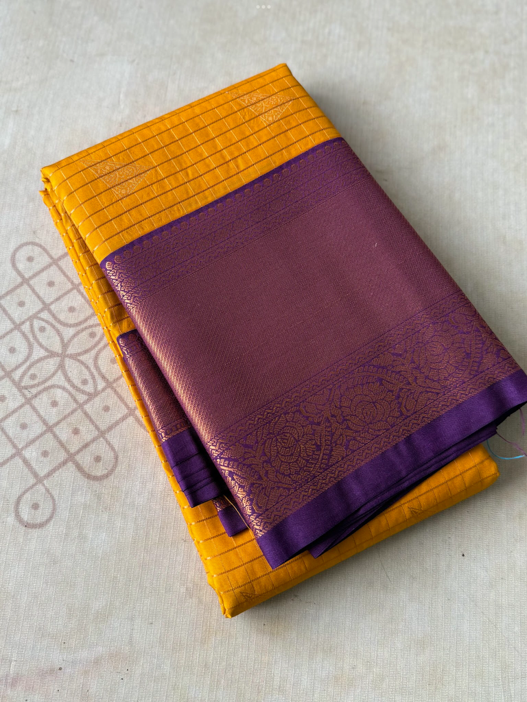 Bring festive charm to your wardrobe with this stunning semi Kanchi silk saree. The body is adorned in a yellow base, decorated with delicate zari buttas that add subtle sparkle and elegance. The traditional zari woven purple border is astonishing with the traditional gold zari detailing.