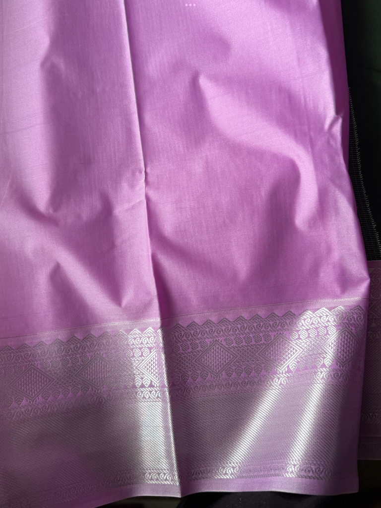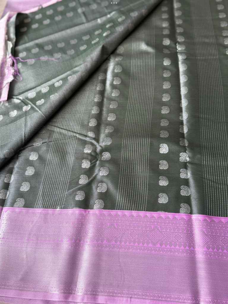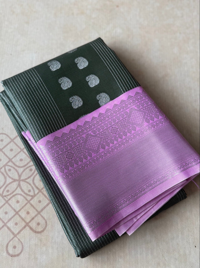 Bring festive charm to your wardrobe with this stunning semi Kanchi silk saree. The body is adorned in a Dark green base, decorated with delicate zari buttas that add subtle sparkle and elegance. The traditional zari woven pink border is astonishing with the traditional gold zari detailing.