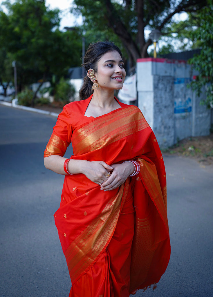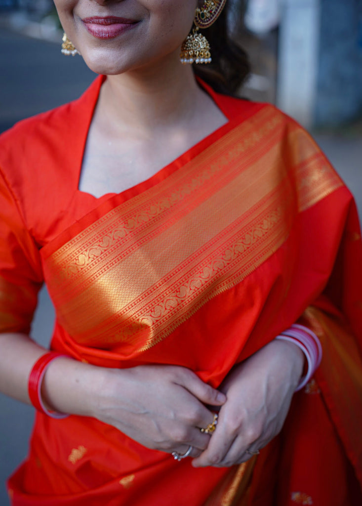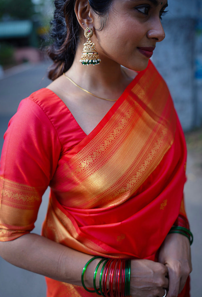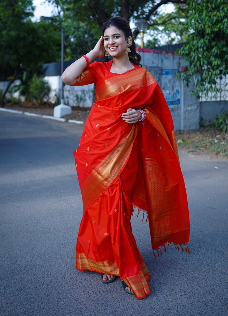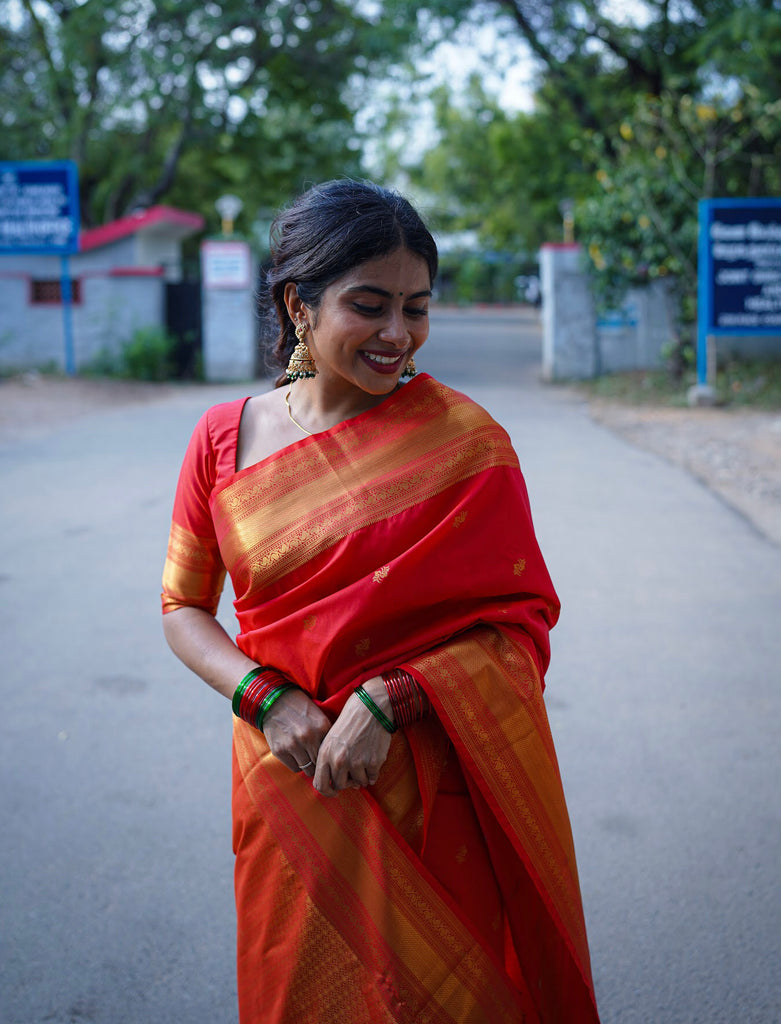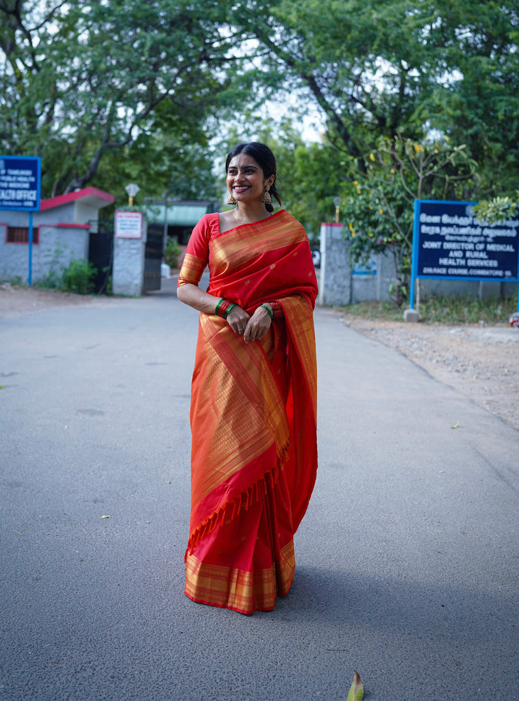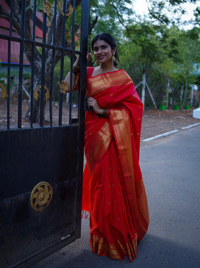 Bring festive charm to your wardrobe with this stunning semi Kanchi silk saree. The body is adorned in a Red base, decorated with delicate golden zari buttas that add subtle sparkle and elegance. The zari border is astonishing with the traditional gold zari detailing.