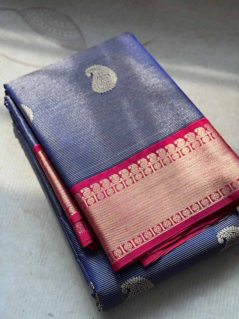 The saree features a striking blue body adorned with subtle woven motifs and a red border, highlighted by intricate gold zari detailing. The contrasting hues create a regal yet refreshing look, ideal for festive occasions, weddings, or special celebrations.