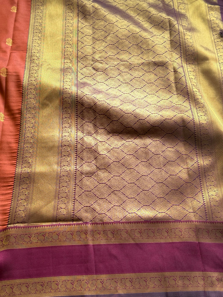 Enhancing its traditional appeal is a striking deep purple Retta Petta (double) border, intricately woven with gold zari detailing, lending a bold contrast and classic Kanchi-inspired finish. The saree is completed with a complementing zari-woven pallu, making it an ideal choice for festive occasions and traditional celebrations.