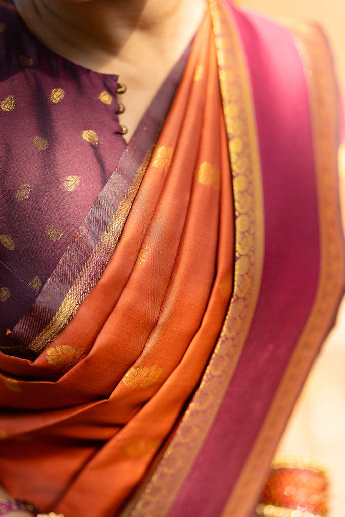 The saree comes paired with a deep purple unstitched blouse piece, designed with delicate zari buttas all over. The blouse is further accentuated with a Retta Petta border featuring golden zari peacock motifs, perfectly harmonizing with the saree’s border and elevating the overall look.