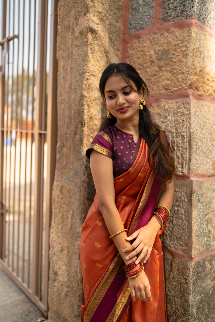 Bring festive charm to your wardrobe with this stunning Semi Kanchi Silk Saree, crafted to reflect timeless South Indian elegance. The saree features a rich rust orange body, beautifully adorned with delicate golden zari buttas that add a subtle sparkle and refined grace.