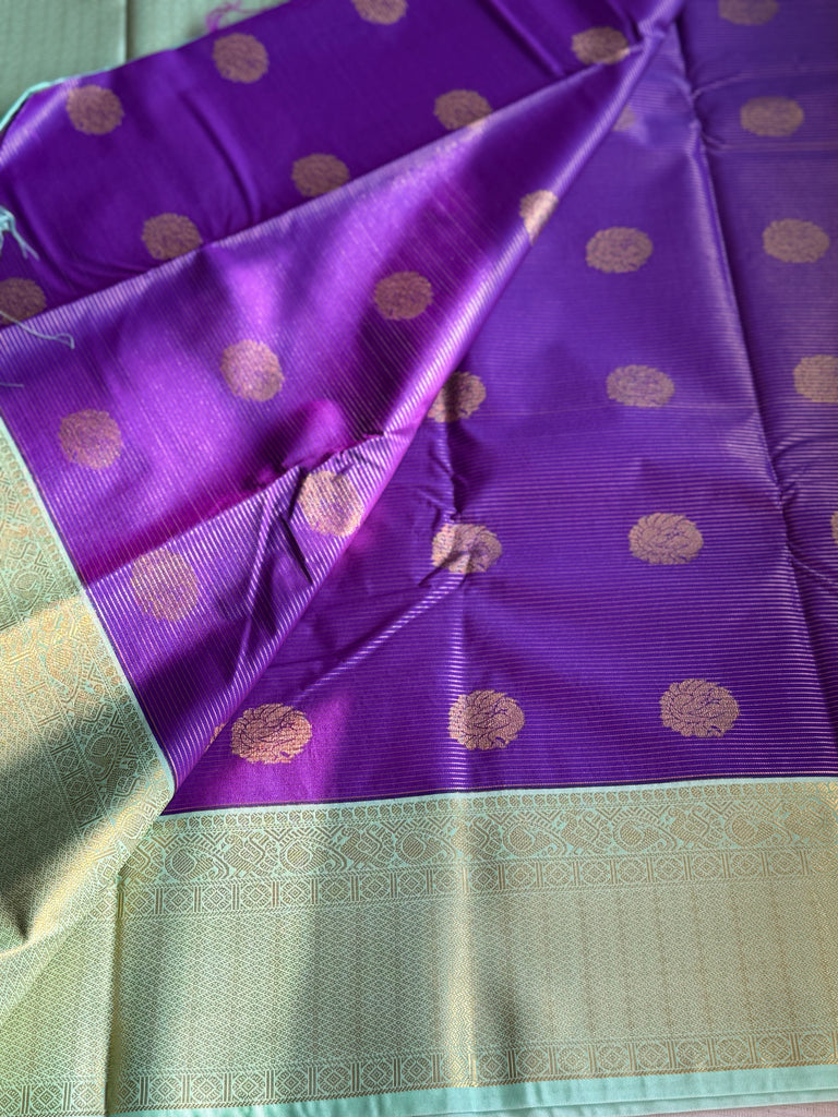 Bring festive charm to your wardrobe with this stunning semi Kanchi silk saree. The body is adorned in a purple base, decorated with delicate golden zari buttas that add subtle sparkle and elegance. The mint green zari border is astonishing with the traditional gold zari detailing.