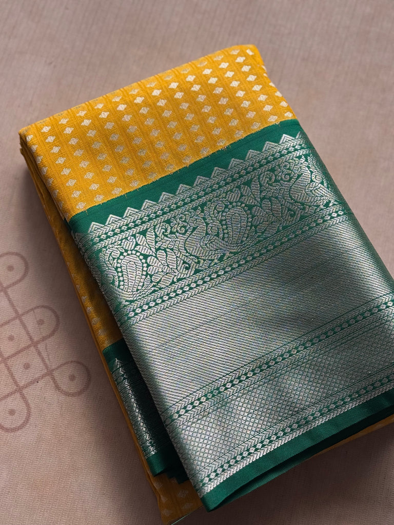 Bring festive charm to your wardrobe with this stunning semi Kanchi silk saree. The body is adorned in a vibrant yellow base, decorated with delicate silver zari buttas that add subtle sparkle and elegance. The contrast emerald green border and pallu steal the spotlight with their intricate silver zari weaving, featuring traditional motifs that exude richness and grandeur.