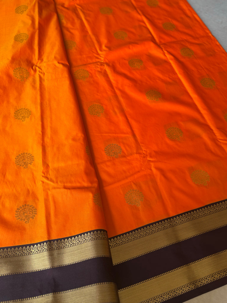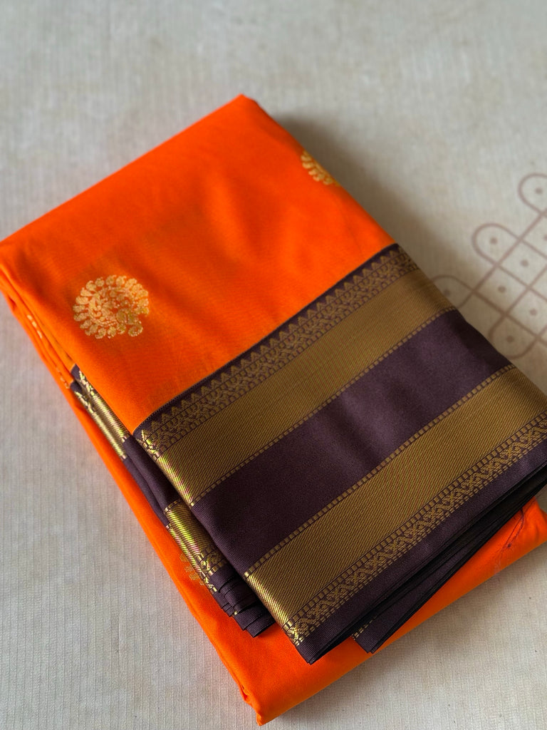 Bring festive charm to your wardrobe with this stunning semi Kanchi silk saree. The body is adorned in a Red base, decorated with delicate golden zari buttas that add subtle sparkle and elegance. The Mint Green zari border is astonishing with the traditional gold zari detailing.