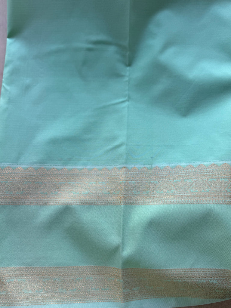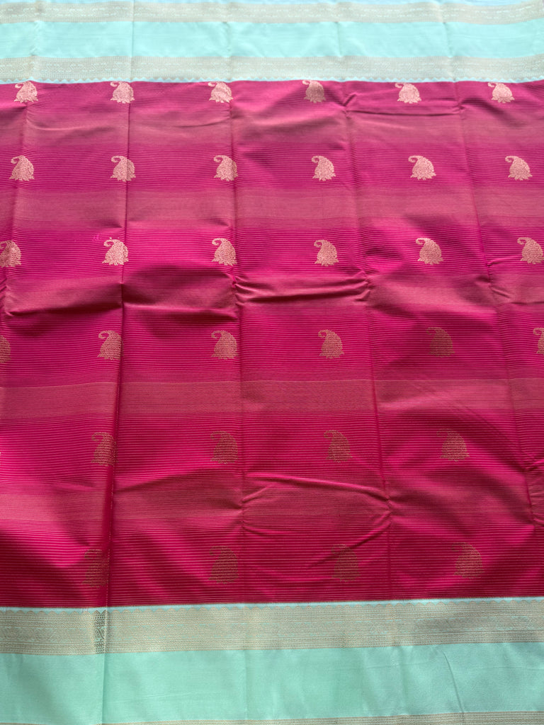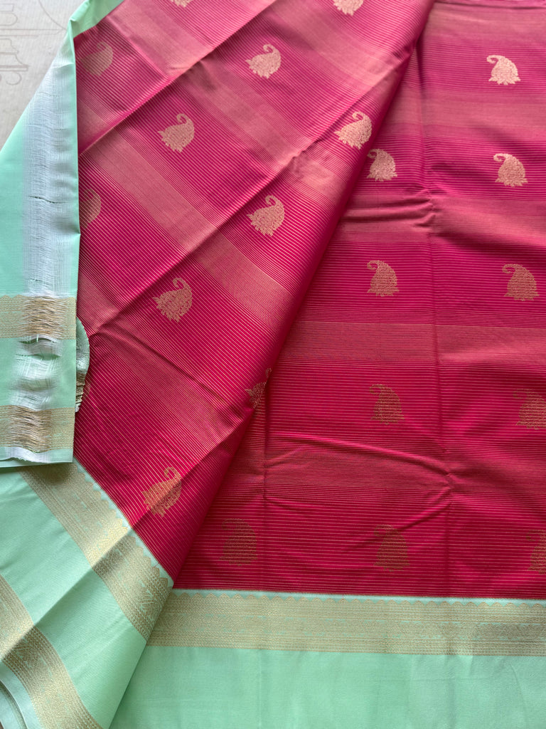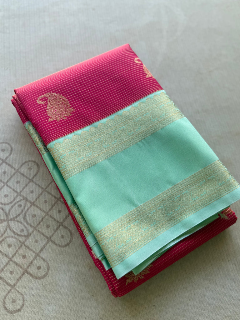 Bring festive charm to your wardrobe with this stunning semi Kanchi silk saree. The body is adorned in hot pink shade, decorated with delicate golden zari buttas that add subtle sparkle and elegance. The mint green shade zari border is astonishing with the traditional gold zari detailing.