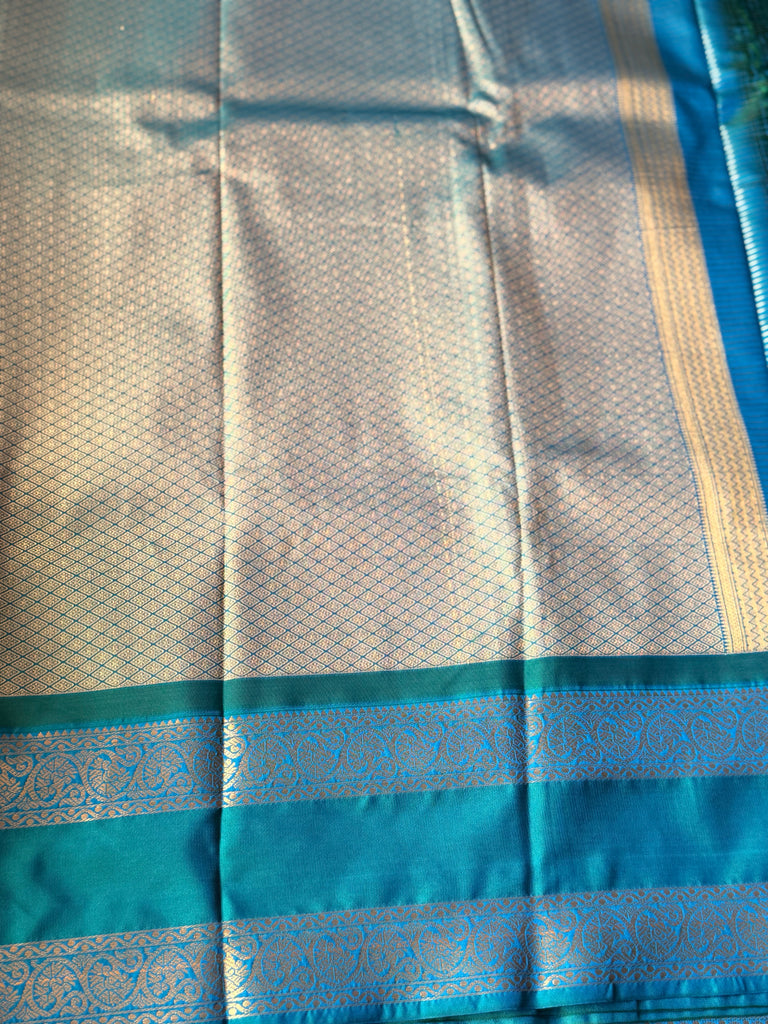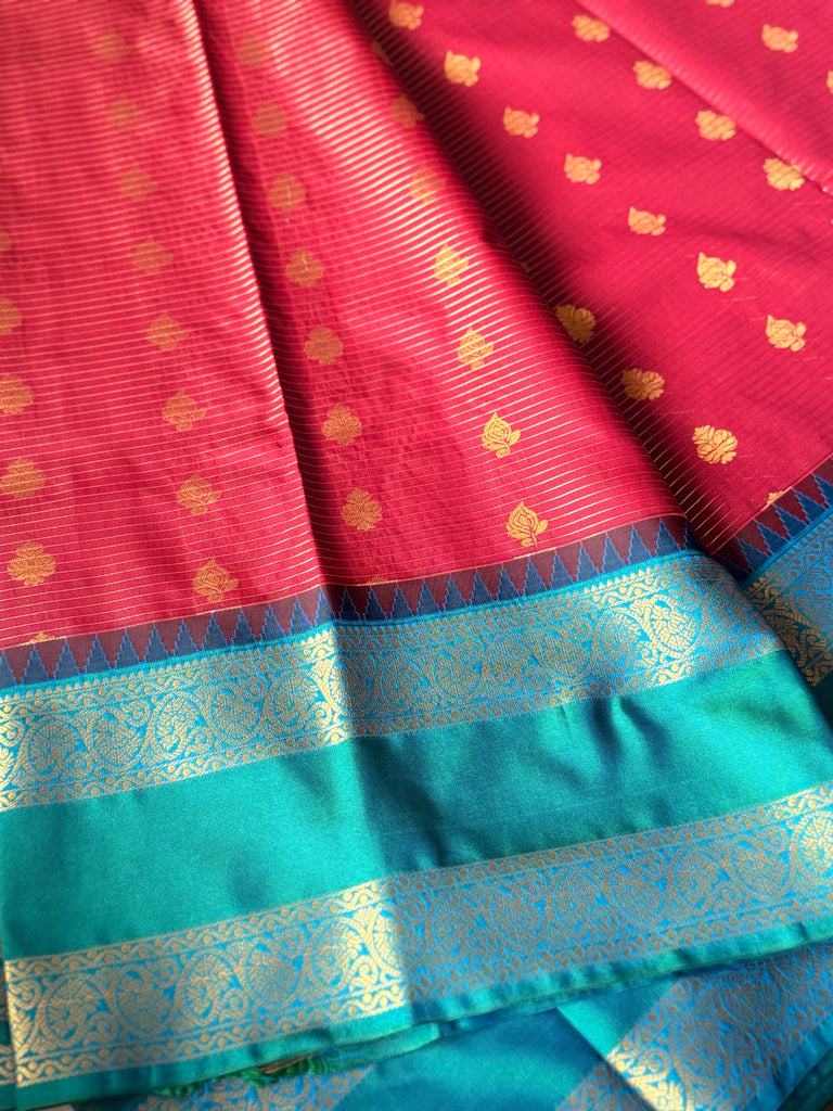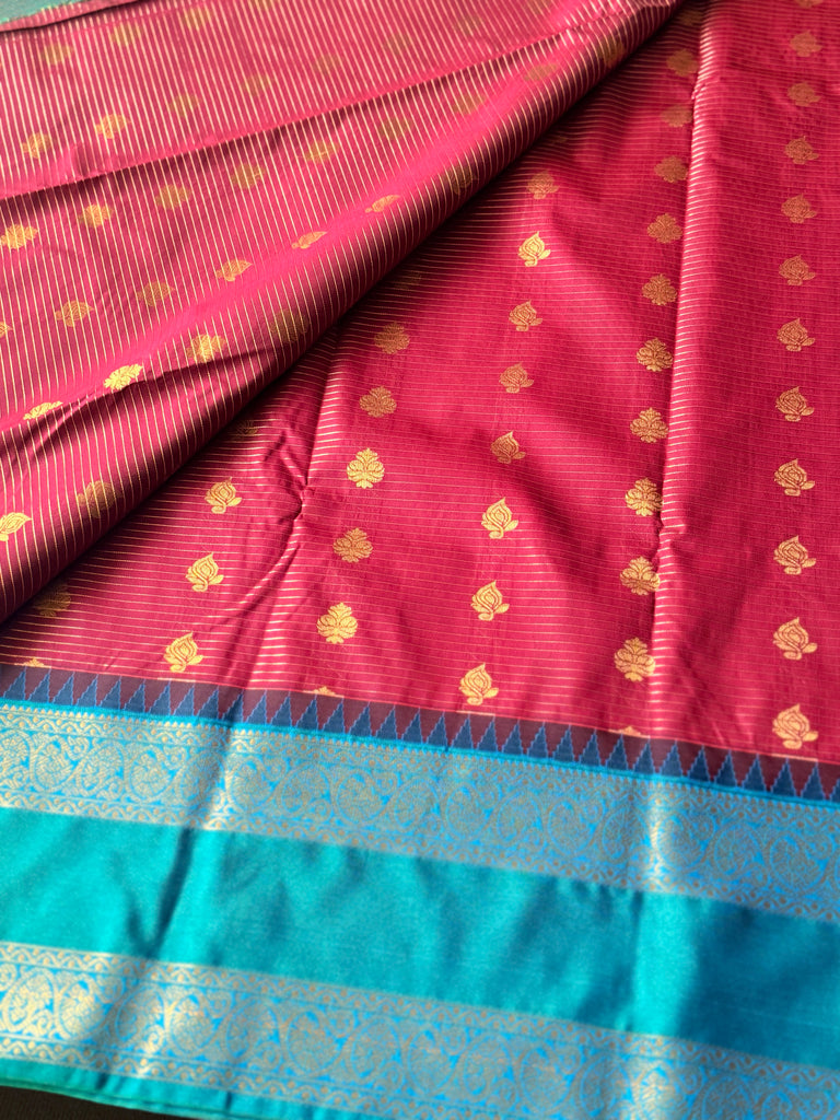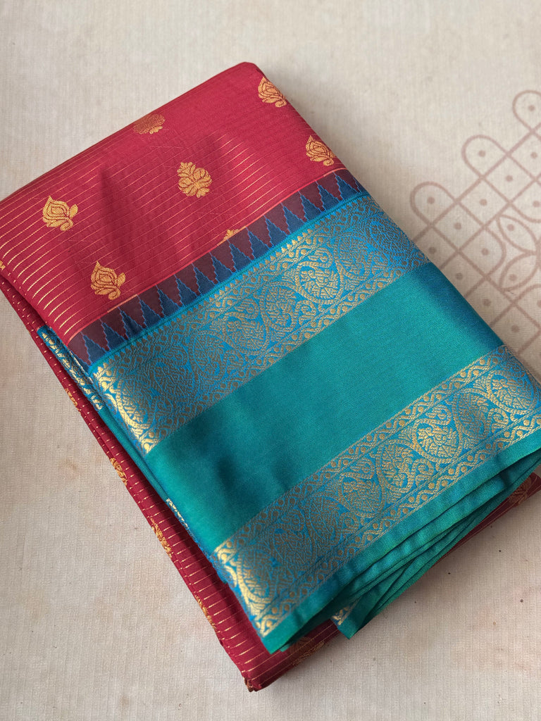 Bring festive charm to your wardrobe with this stunning semi Kanchi silk saree. The body is adorned in a Maroon base, decorated with delicate gold zari buttas that add subtle sparkle and elegance. The Turquoise blue zari border is astonishing with the traditional gold zari detailing.