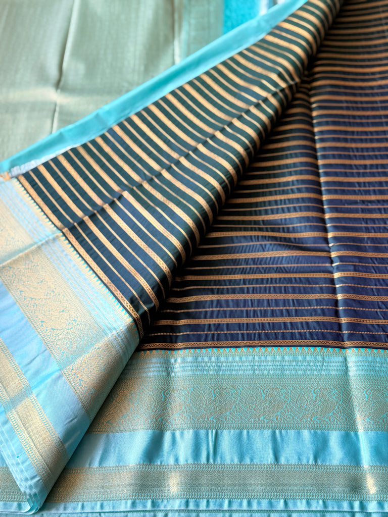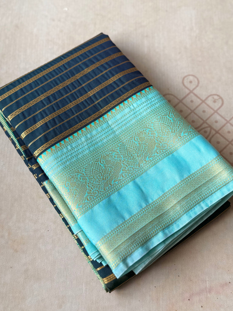 Bring festive charm to your wardrobe with this stunning semi Kanchi silk saree. The body is adorned in a Deep forest green base, decorated with delicate gold zari buttas that add subtle sparkle and elegance. The light blue zari border is astonishing with the traditional gold zari detailing.